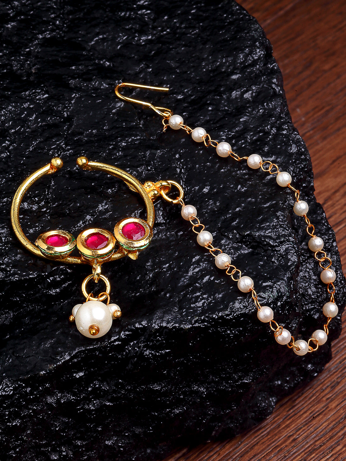 Karatcart presents this beautiful gold plated nose ring with a pearl chain. Wear this nath...
