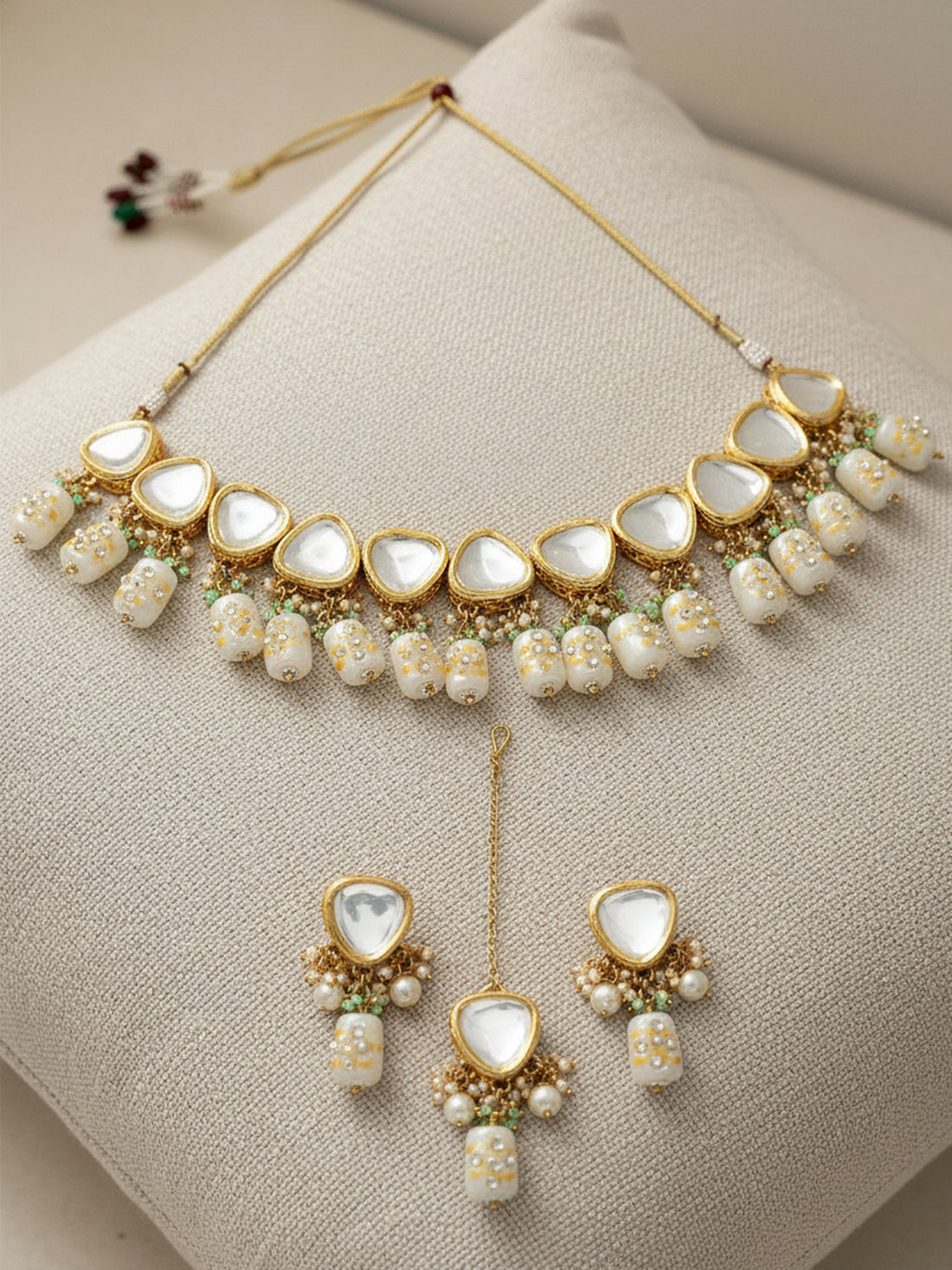 Gold-Plated White Kundan-Studded Beaded Jewellery Set