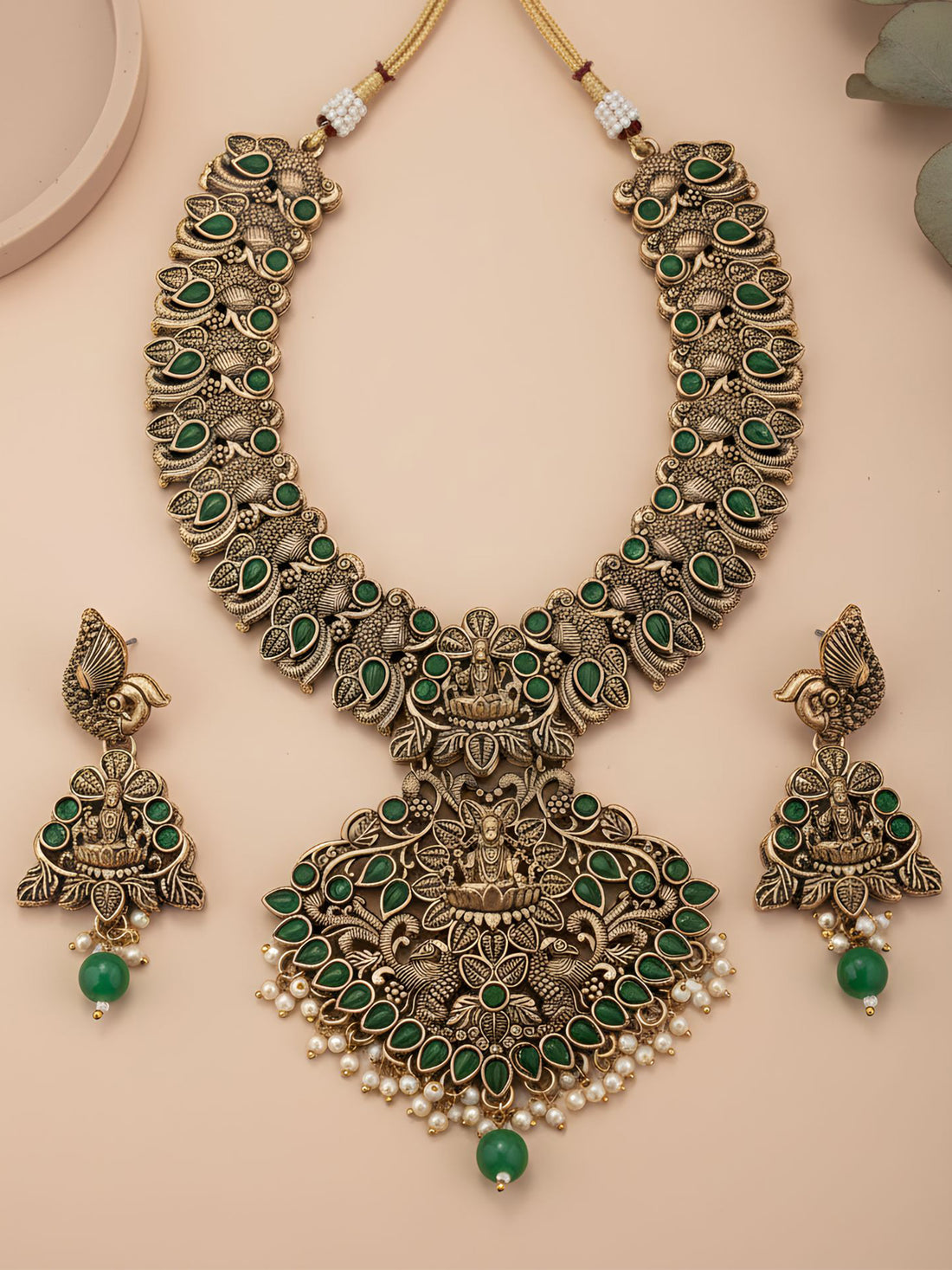 Karatcart Traditional Gold Plated Green Stone Laxmi Mata Temple Jewellery Set for Women. Our products...