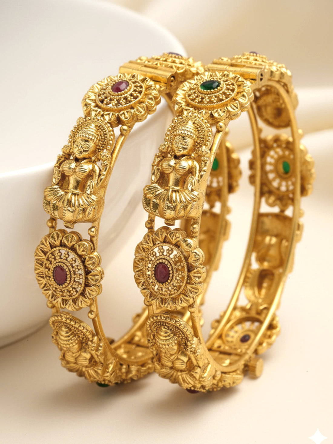 Karatcart Floral Design Gold Plated Set of 2 Laxmi Mata Temple Bangles for Women