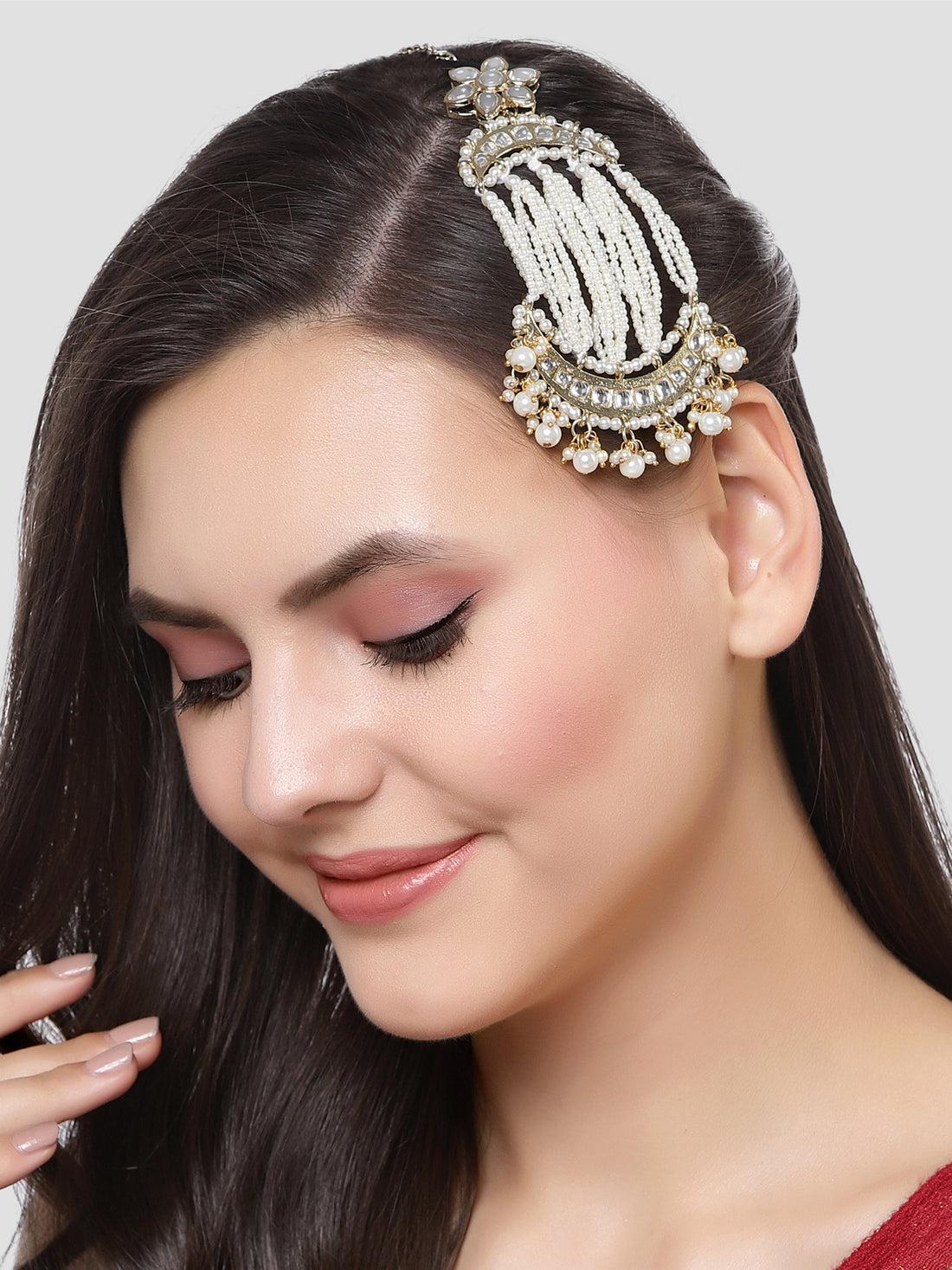 Karatcart Gold Plated Pearl Beads Studded Moon Design Kundan Passa for Women