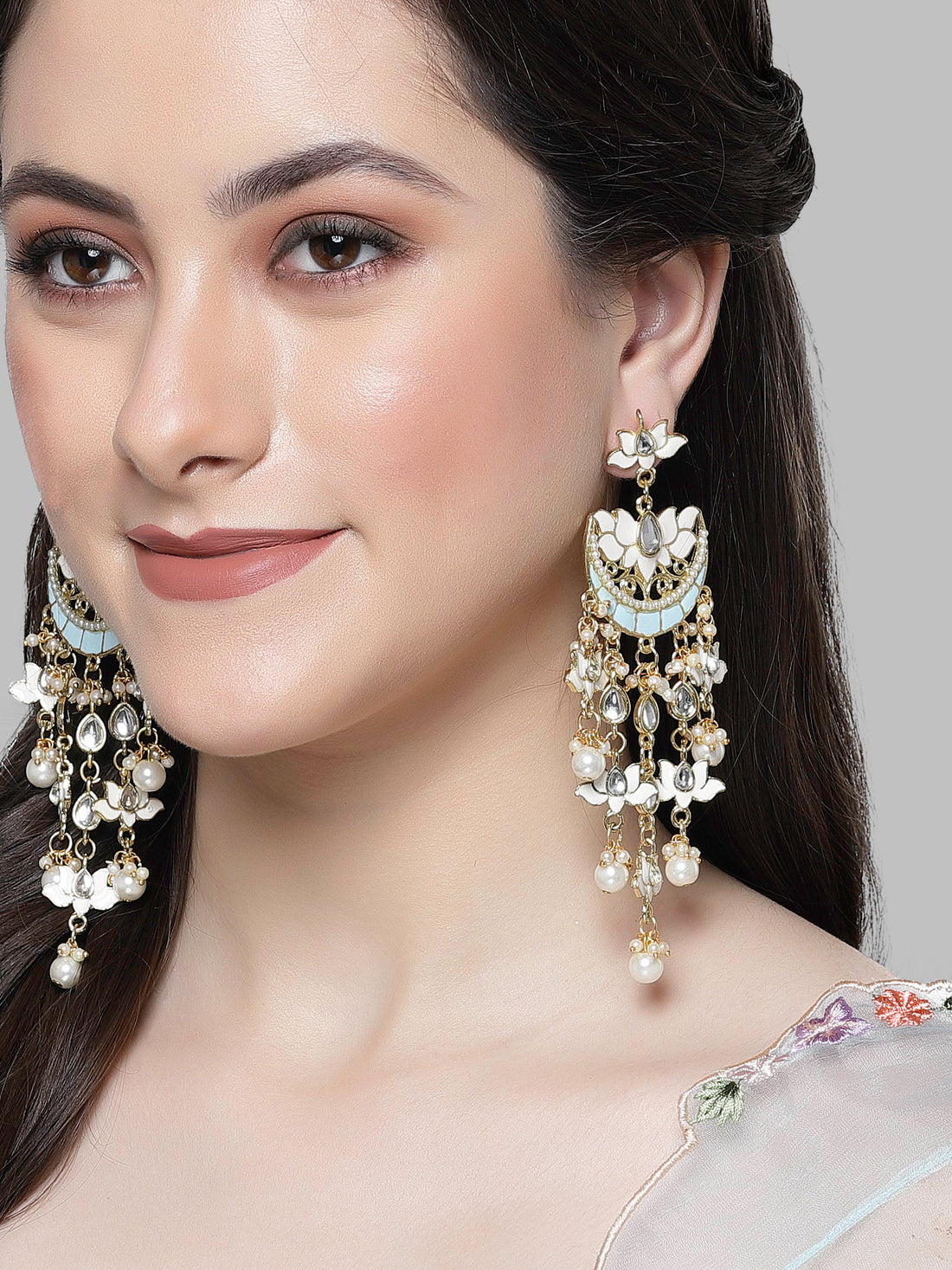 Karatcart Gold Plated White Meena Lotus Design Kundan Drop Earrings for Women