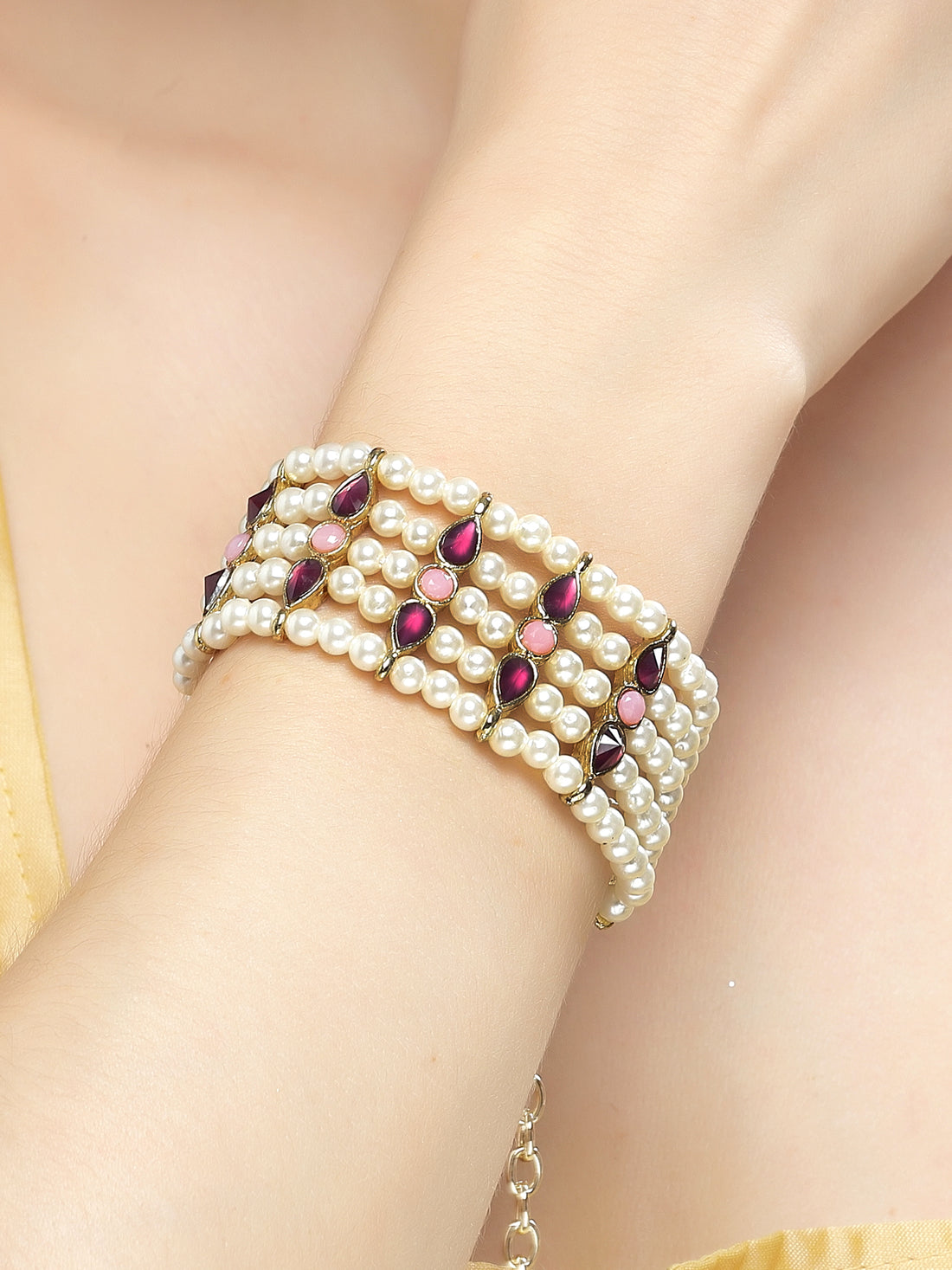 Karatcart Purple and Pink Stone Studded Pearl Beaded Kundan Bracelet for Women