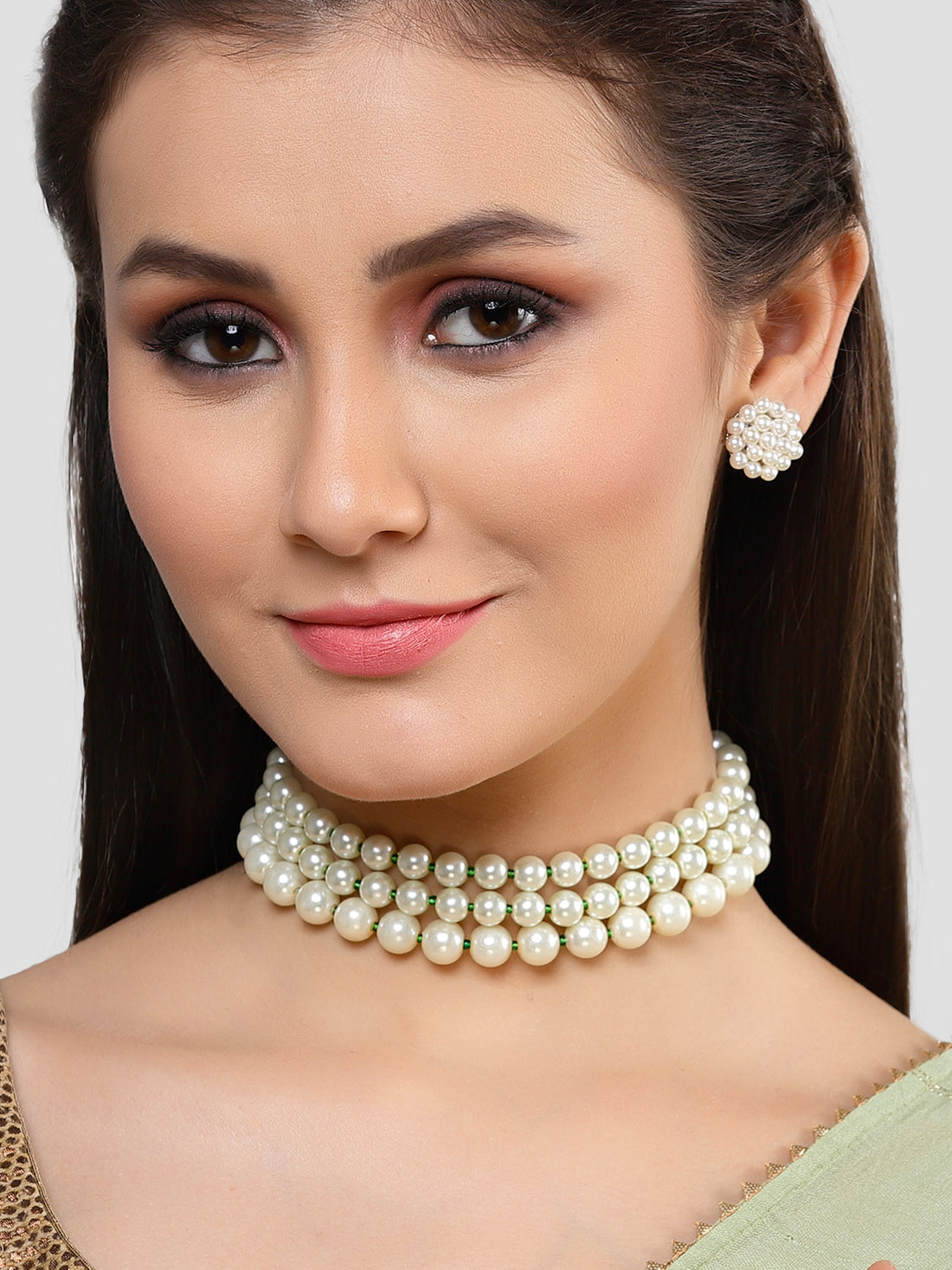 Karatcart Gold Plated White Pearl and Green Beaded Kundan Choker Necklace Set for Women
