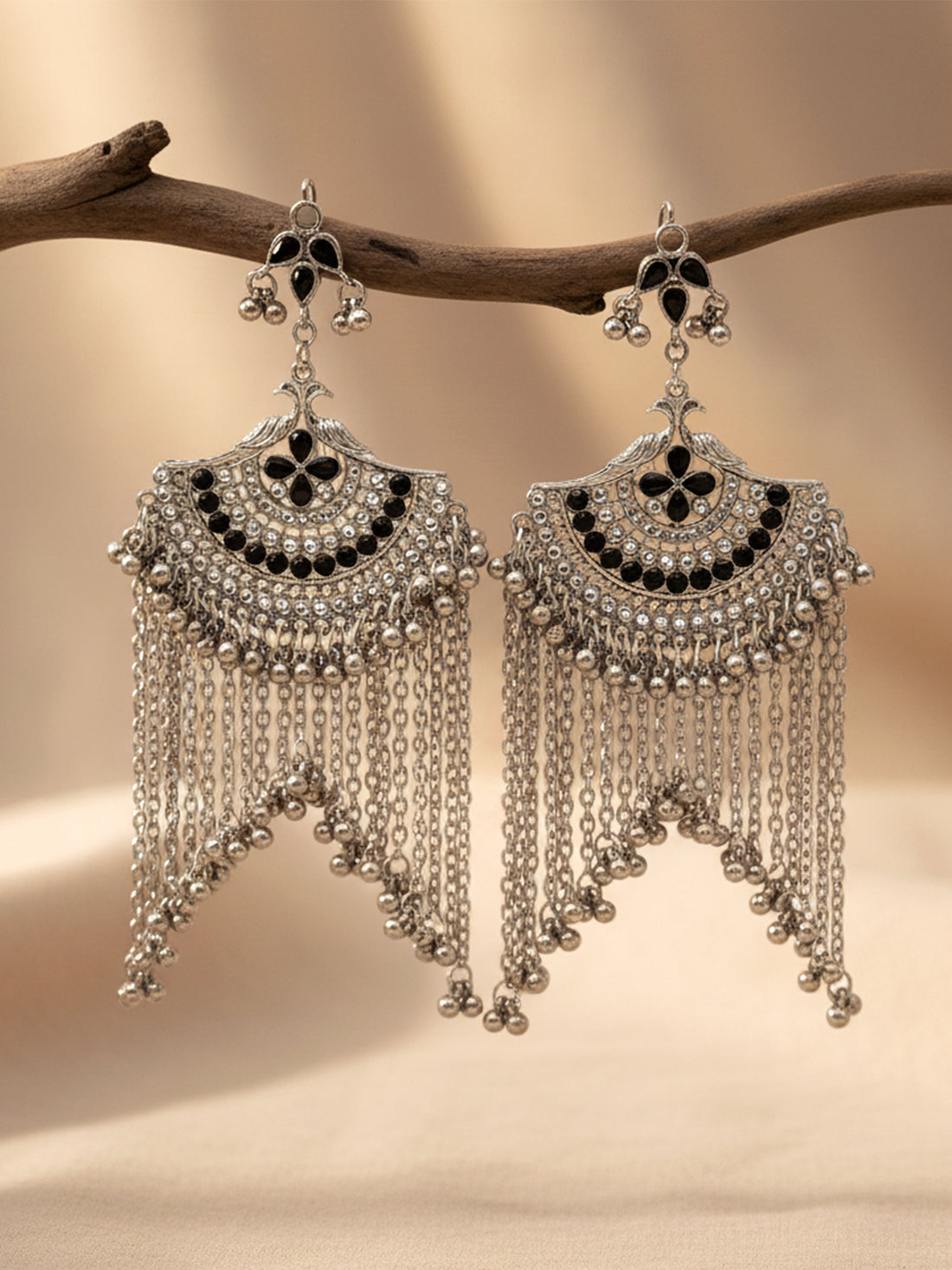 Karatcart Oxidised Silver Black Kundan Chandbali Earrings with Tasselsfor Women
