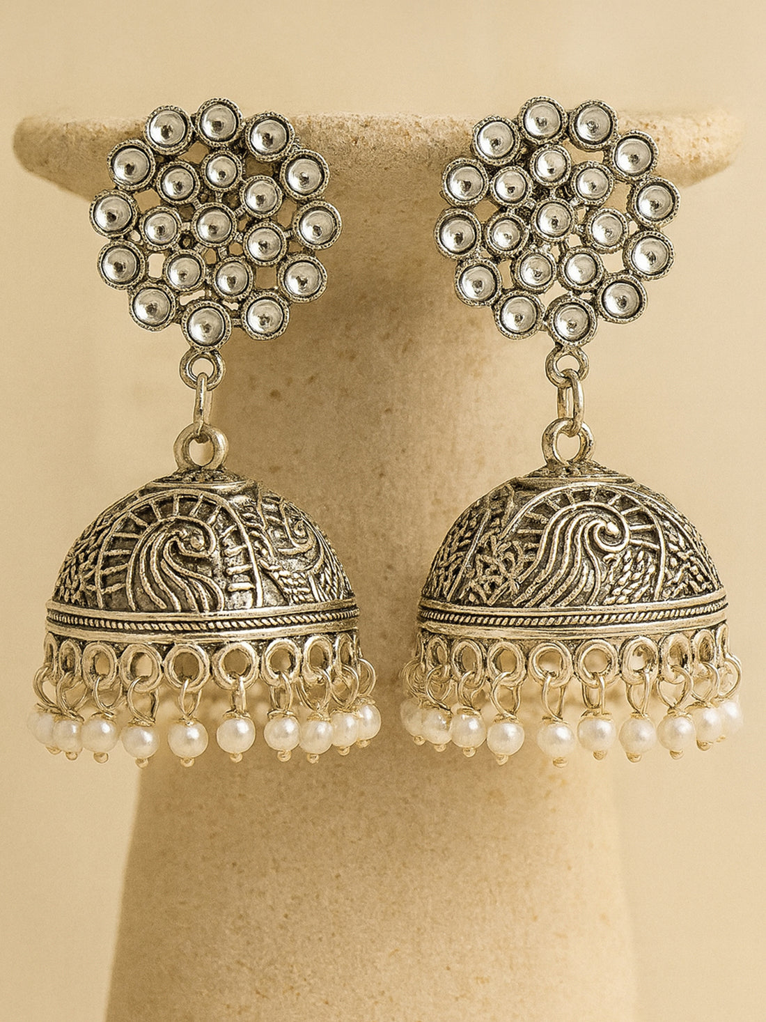 Silver-Toned Floral Kundan Studded Jhumkas Earrings