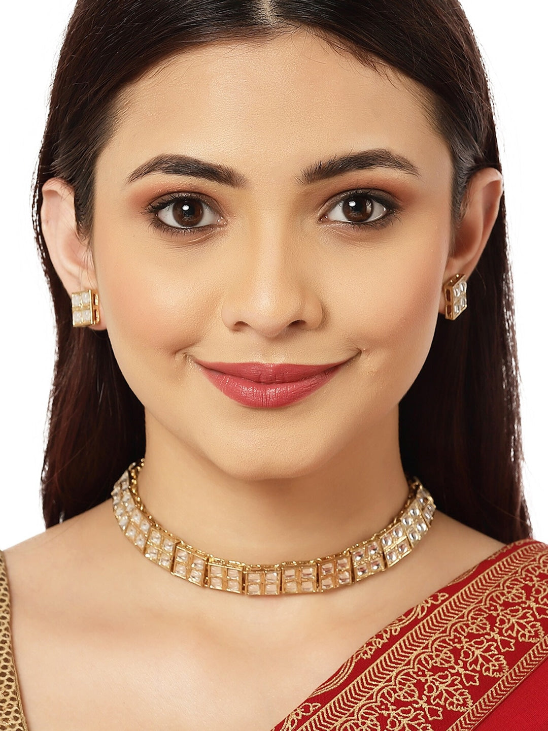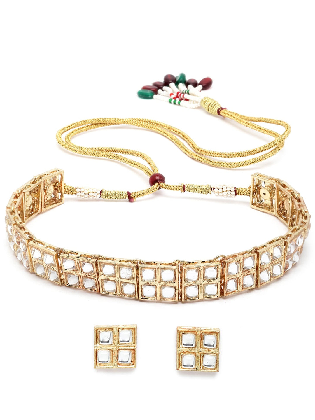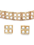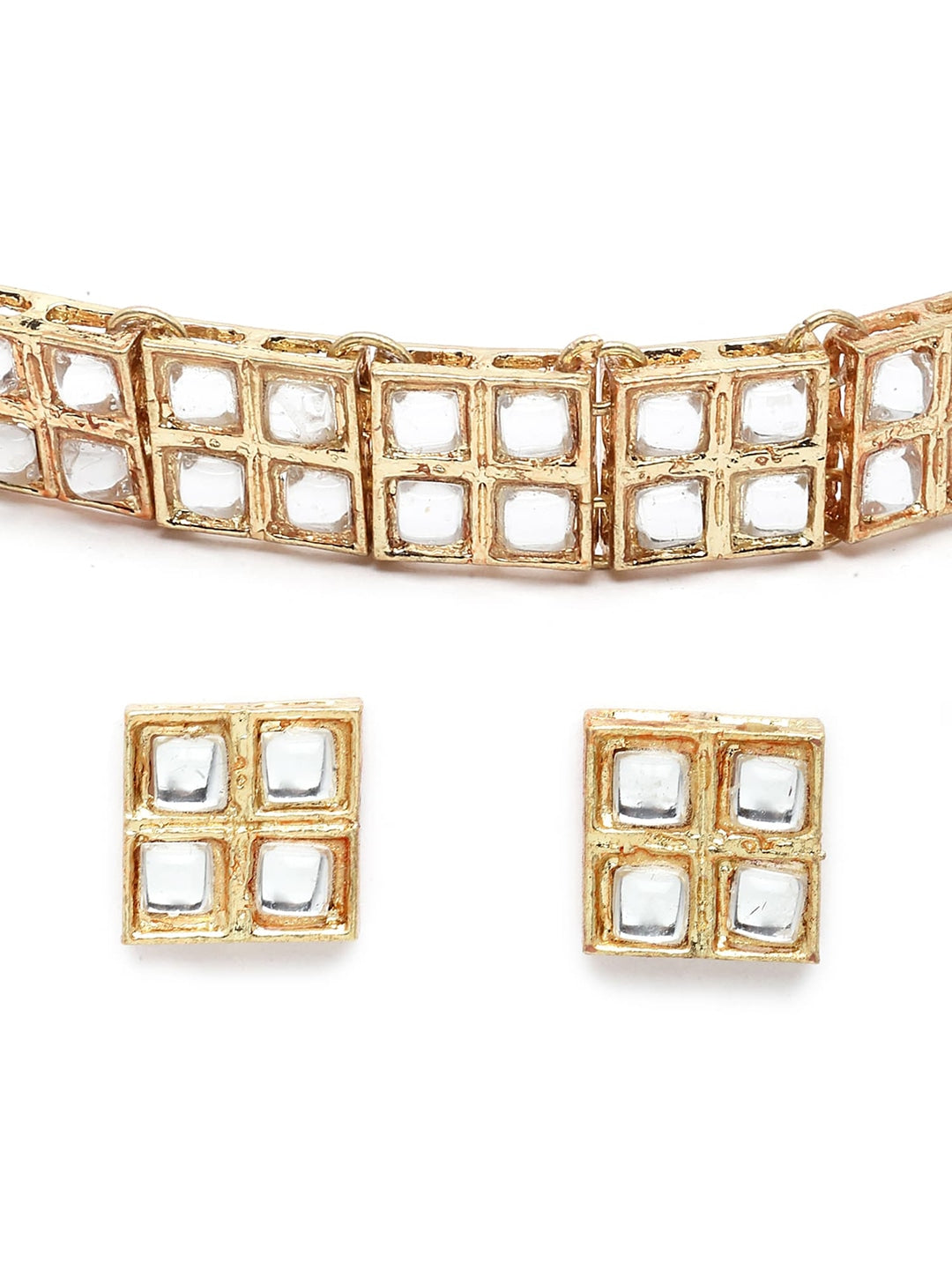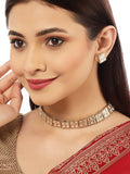 Gold-plated handcrafted chocker necklace has white kundan-studded