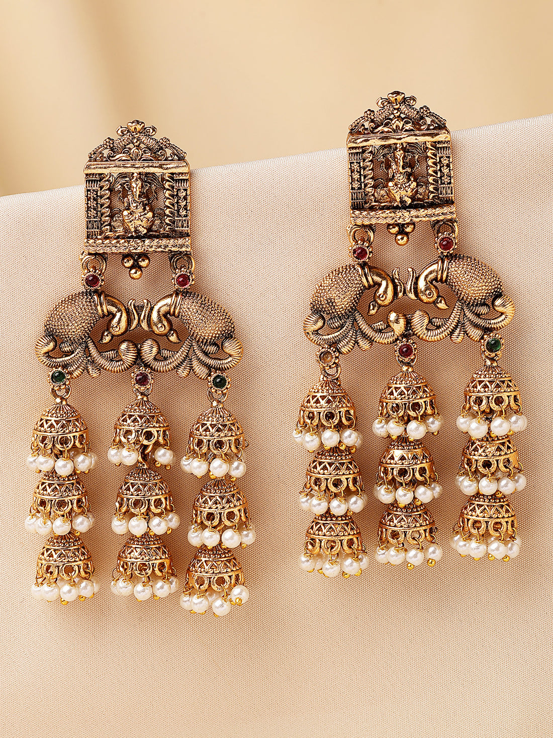 KARATCART Traditional Gold-Plated Peacock Temple Jhumki Earrings with Pearl Drops for Women