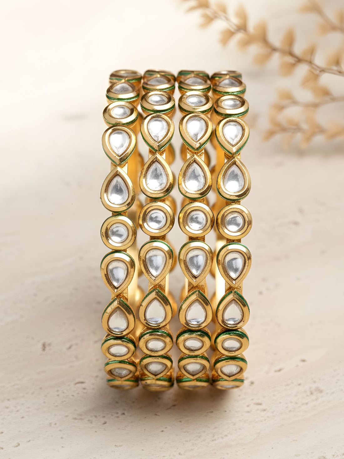 Karatcart Set of 4 Gold Plated Round and Drop Shape Polki Kundan Studded Bangles for Women