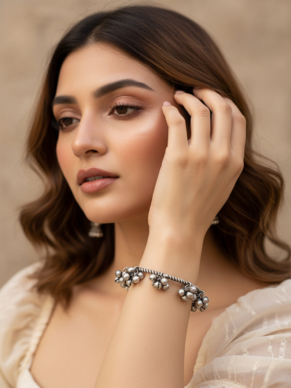 KARATCART Tribal Oxidized Silver Ghungroo Studded Twisted Wire Design Open Cuff Bangles for Women