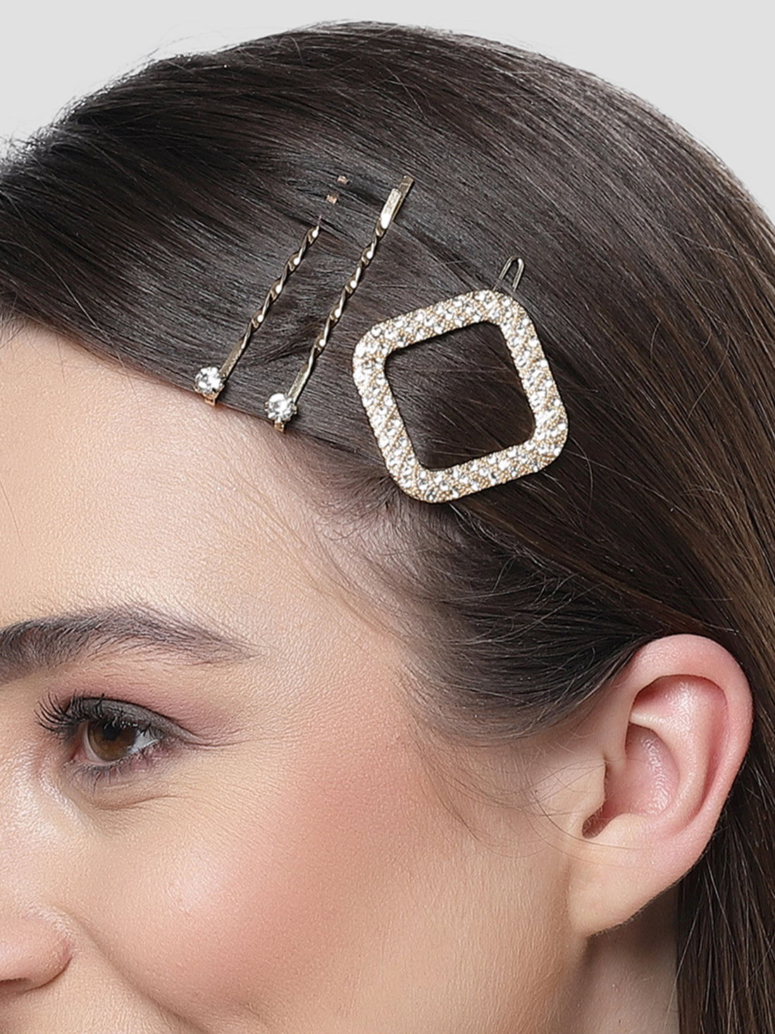 Bohey by KARATCART Gold Tone Set of 3 Crystal Studded Square Hair Clips for Women