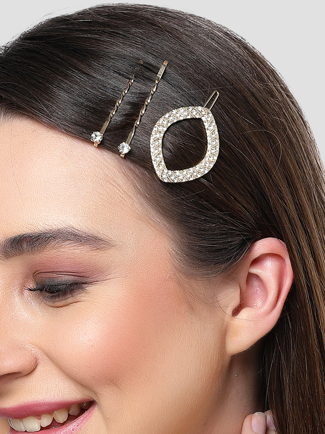 Bohey by KARATCART Gold Tone Set of 3 Crystal Studded Oval Hair Clips for Women