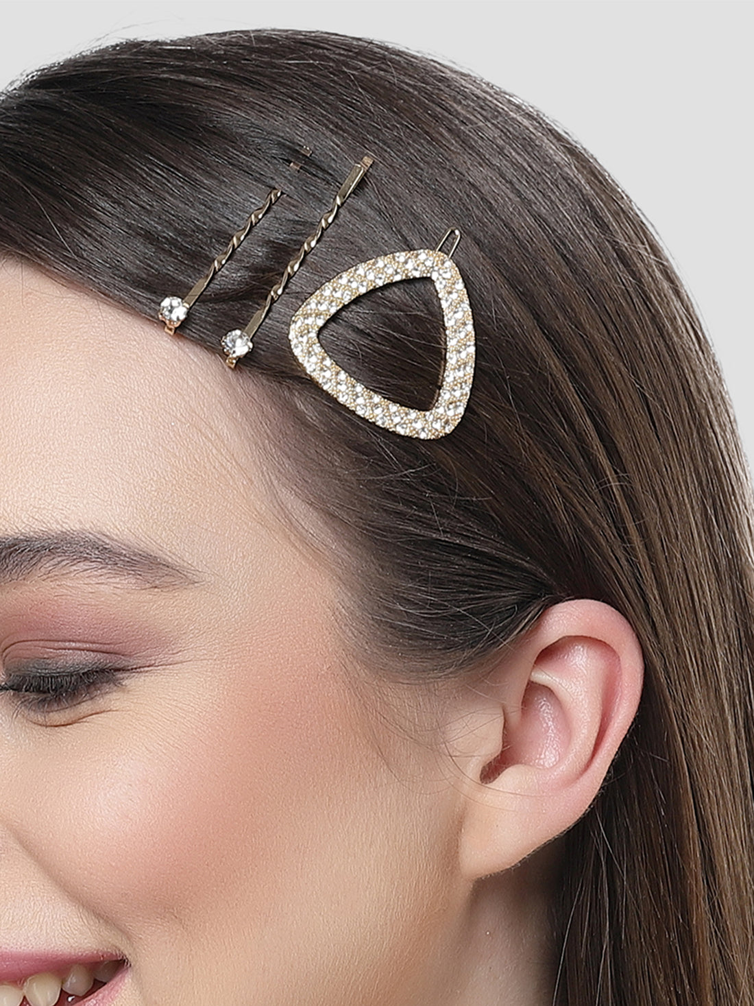 Bohey by KARATCART Gold Tone Set of 3 Crystal Studded Triangle Hair Clips for Women