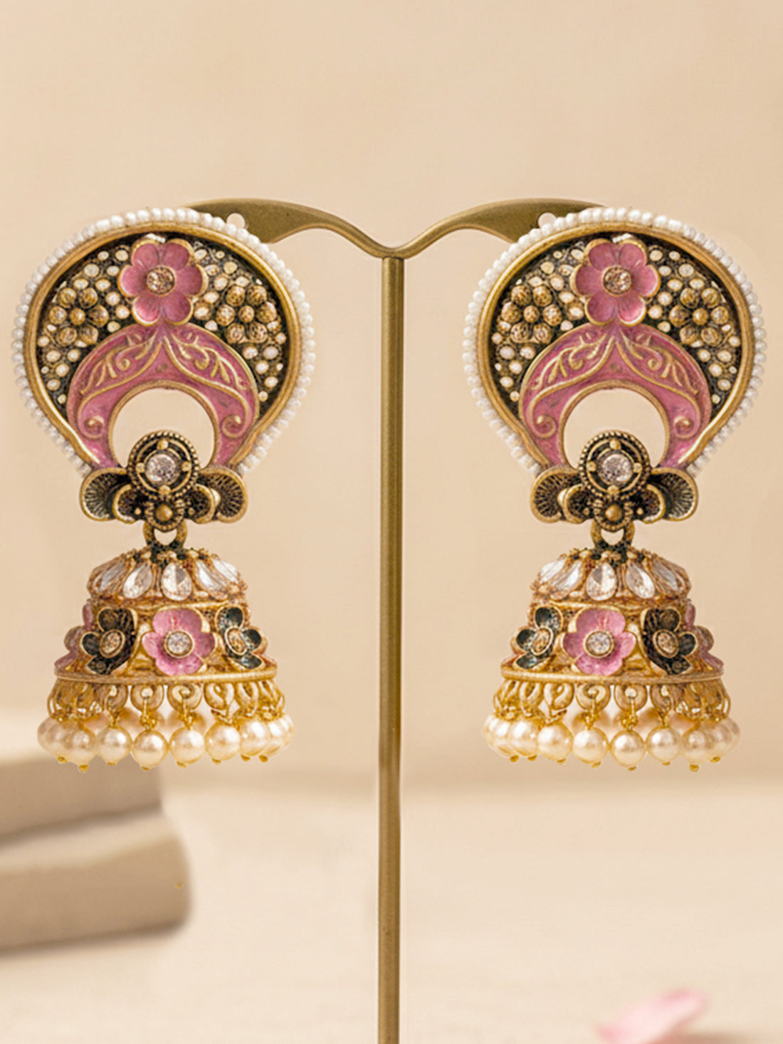 Karatcart Gold Plated Pink Meena and Pearl Studded Jhumki Earrings for Women