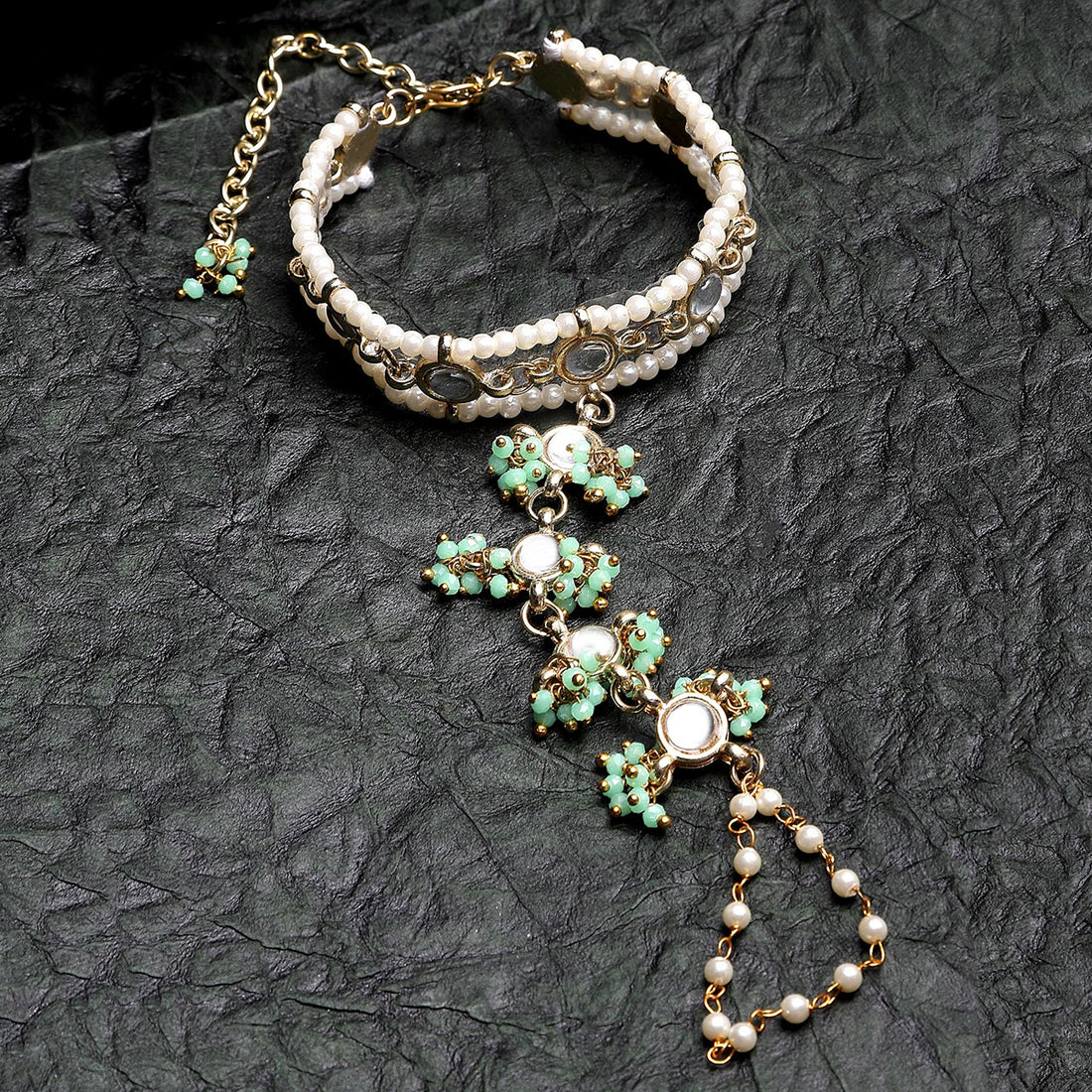 Karatcart Gold Plated Light Green Pearl Beaded Kundan Hathphool