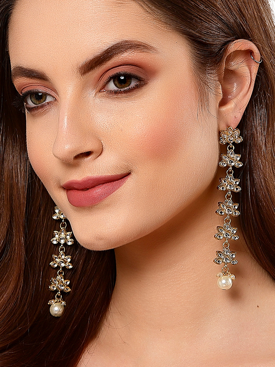Gold Plated Floral Shaped Kundan Studded Drop Earrings