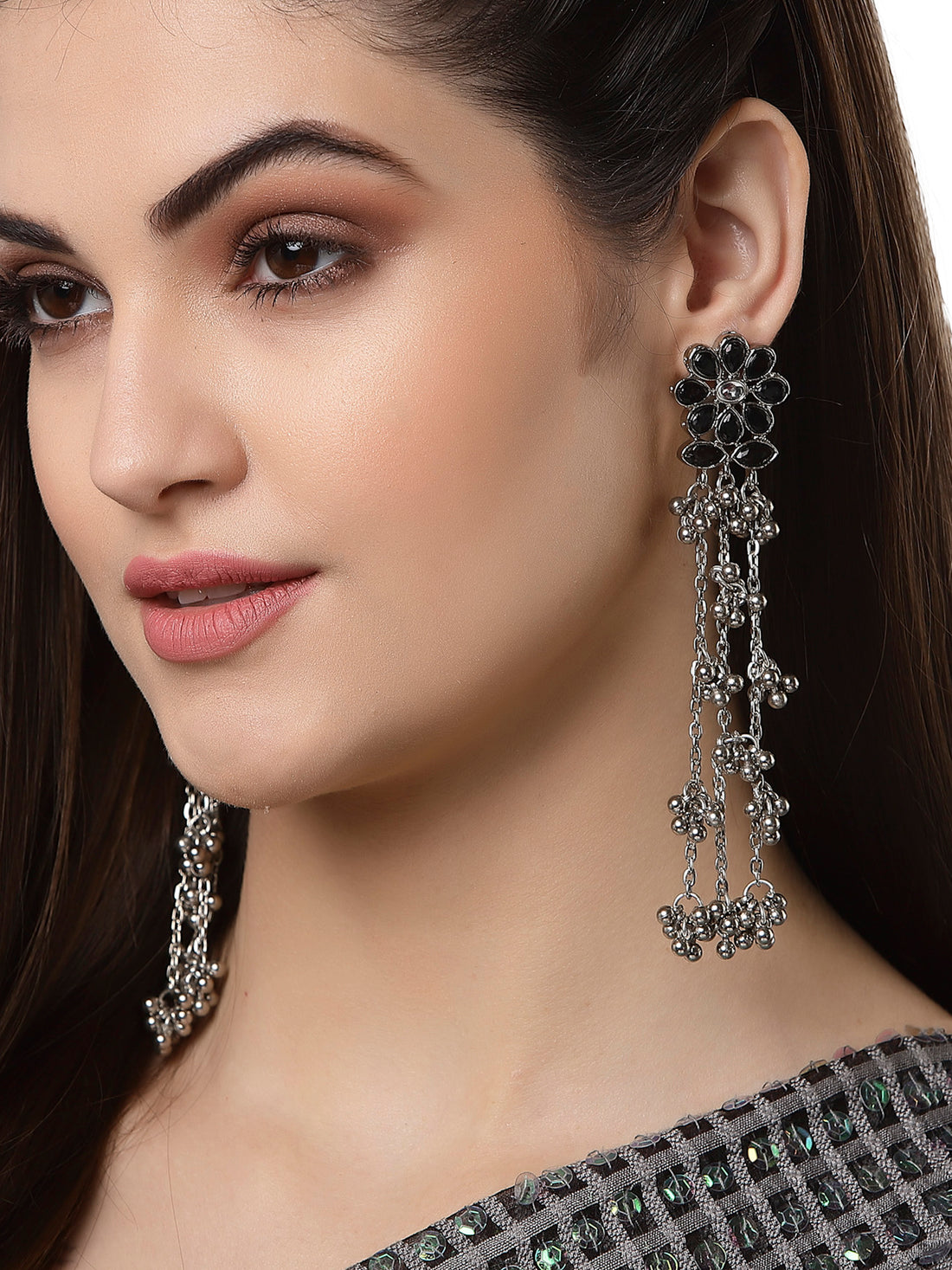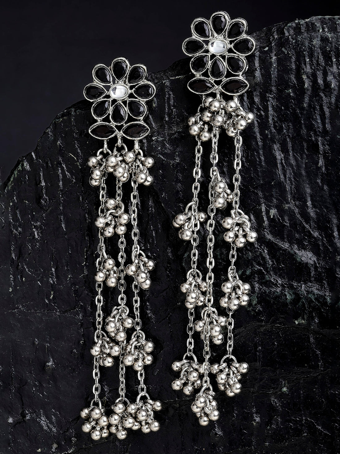 Oxidised Silver Black Kundan Floral Tassel Earrings