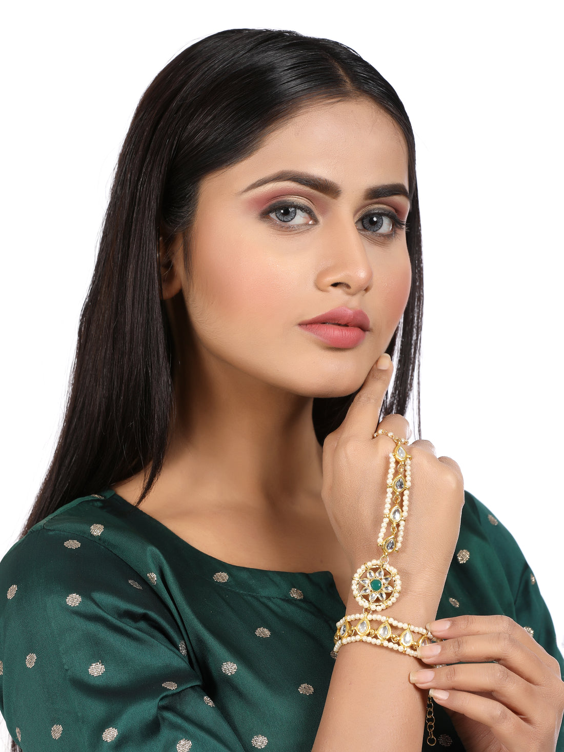 Gold-Plated Pearl Beads Kundan Chain Hathphool with Green Stone
