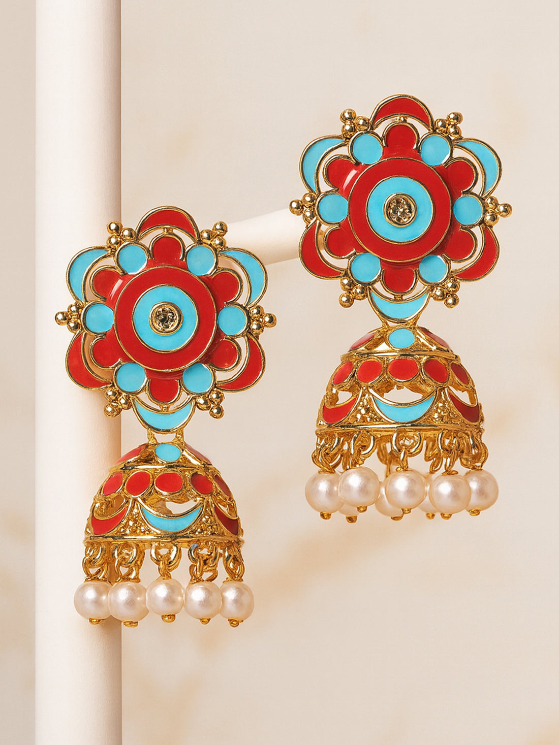 Karatcart Rose Gold Plated Floral Design Red and Blue Meena Jhumki Earrings for Women
