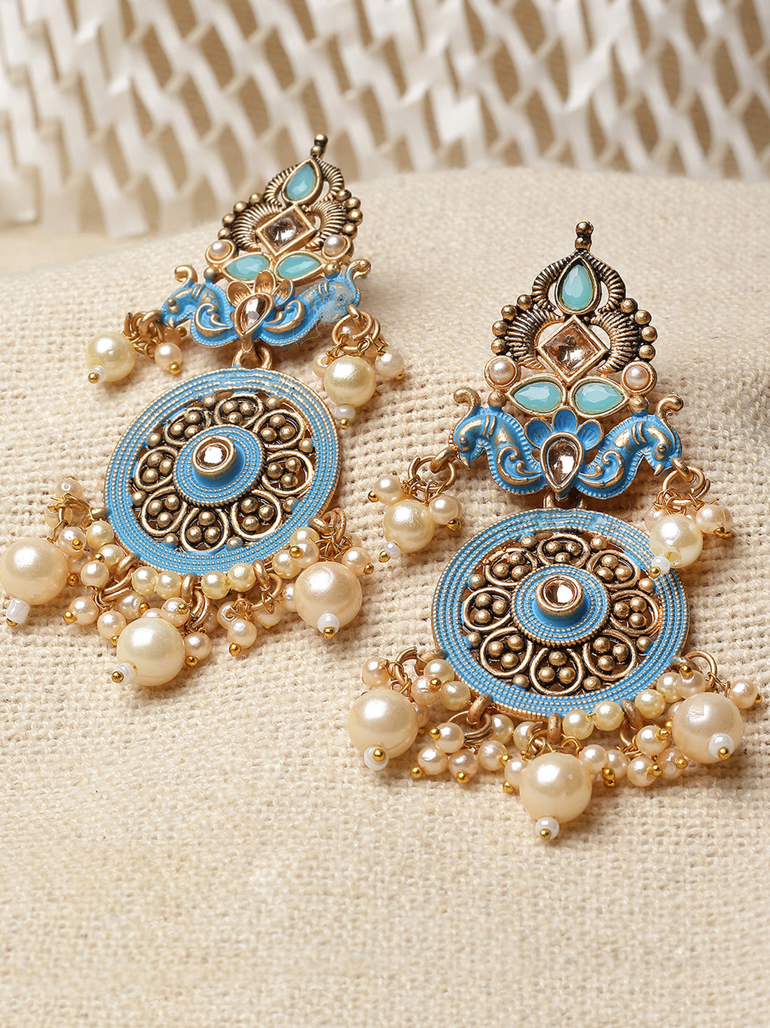 Karatcart Gold Plated Peacock Design Light Blue and Red Meena Drop Earrings for Women