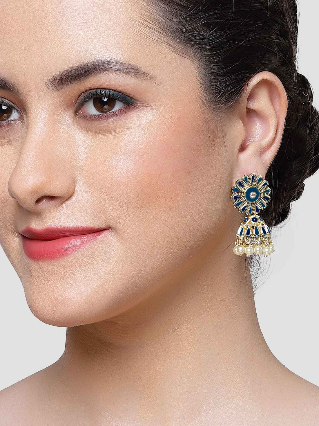Karatcart Gold Plated Floral Design Blue Meena Jhumki Earrings for Women
