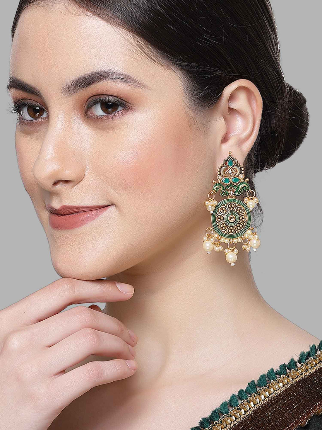 Karatcart Gold Plated Green Meena Kundan Dangler Earrings for Women