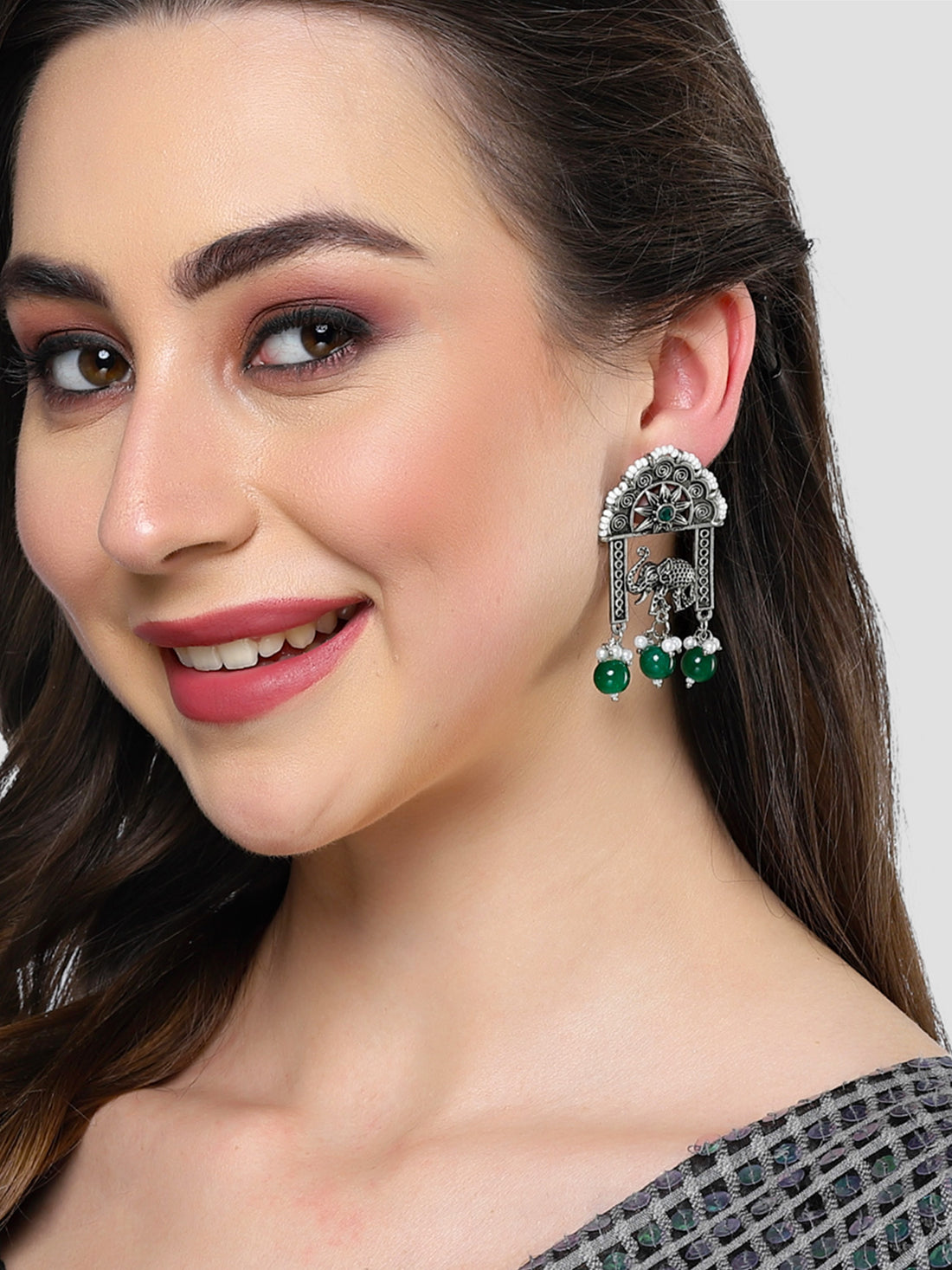 Karatcart Oxidised Silver Green Beads Elephant Design Dangler Earrings for Women