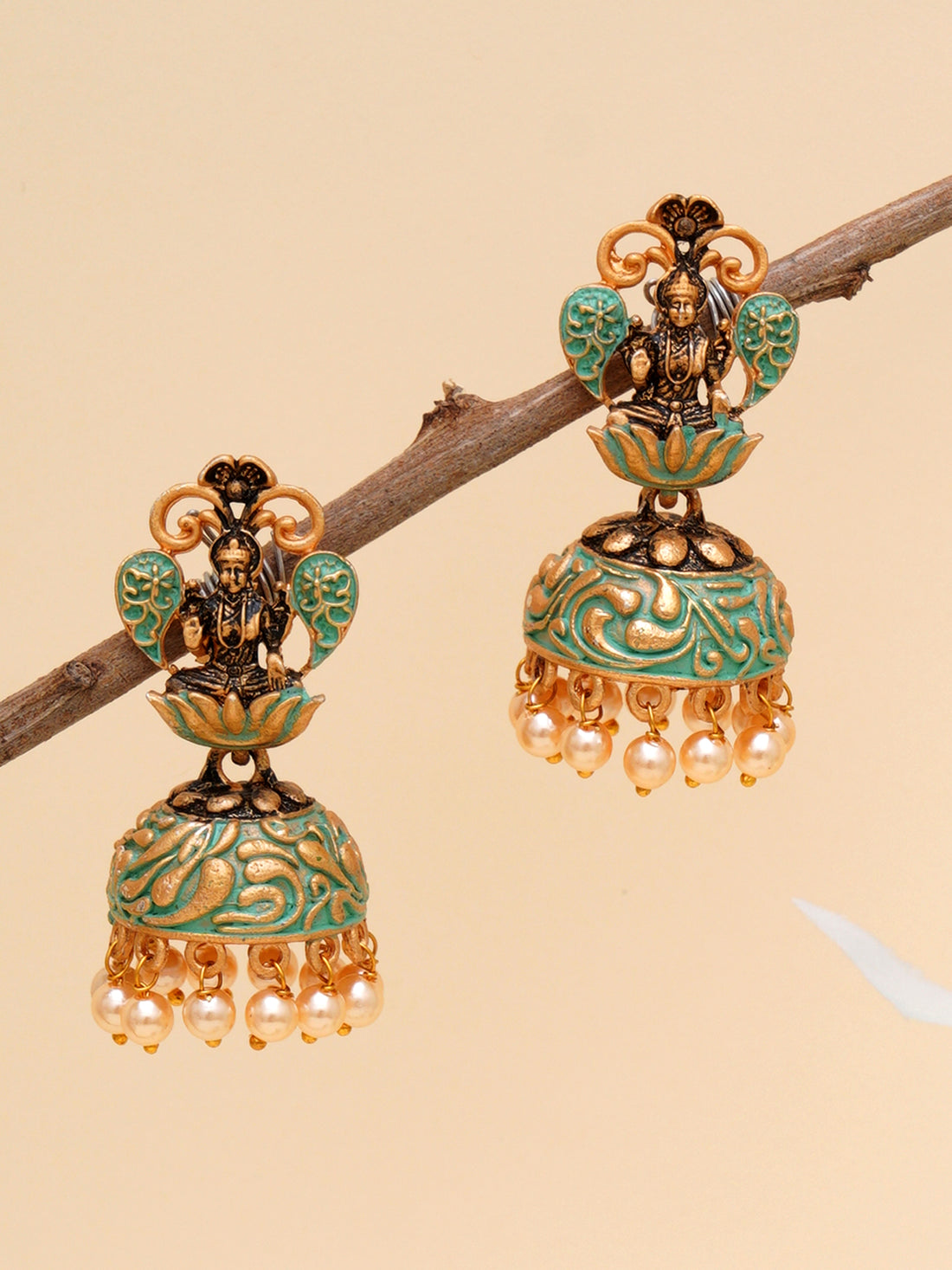 Karatcart Gold Plated Green Meena Mata Laxmi Jhumki Earrings for Women. Our products are designed...