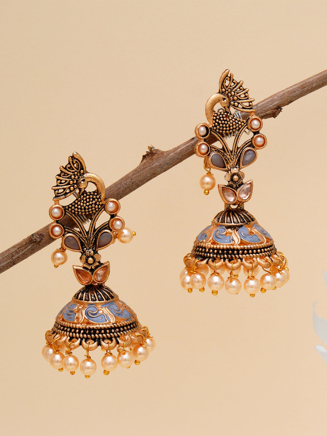 Karatcart Gold Plated Grey Stone Studded Peacock Shape Jhumki Earrings for Women