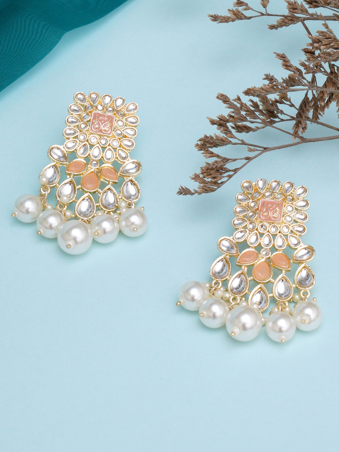Karatcart Gold Plated Peach and Pearl Studded Kundan Dangler Earrings for Women