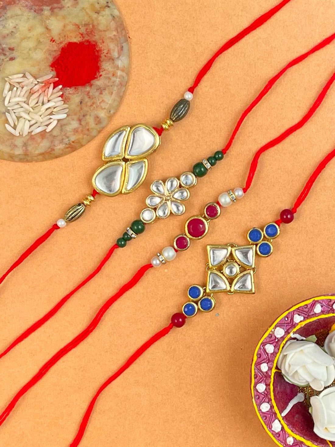Set of 4 Gold Plated Kundan Rakhi For Brother.