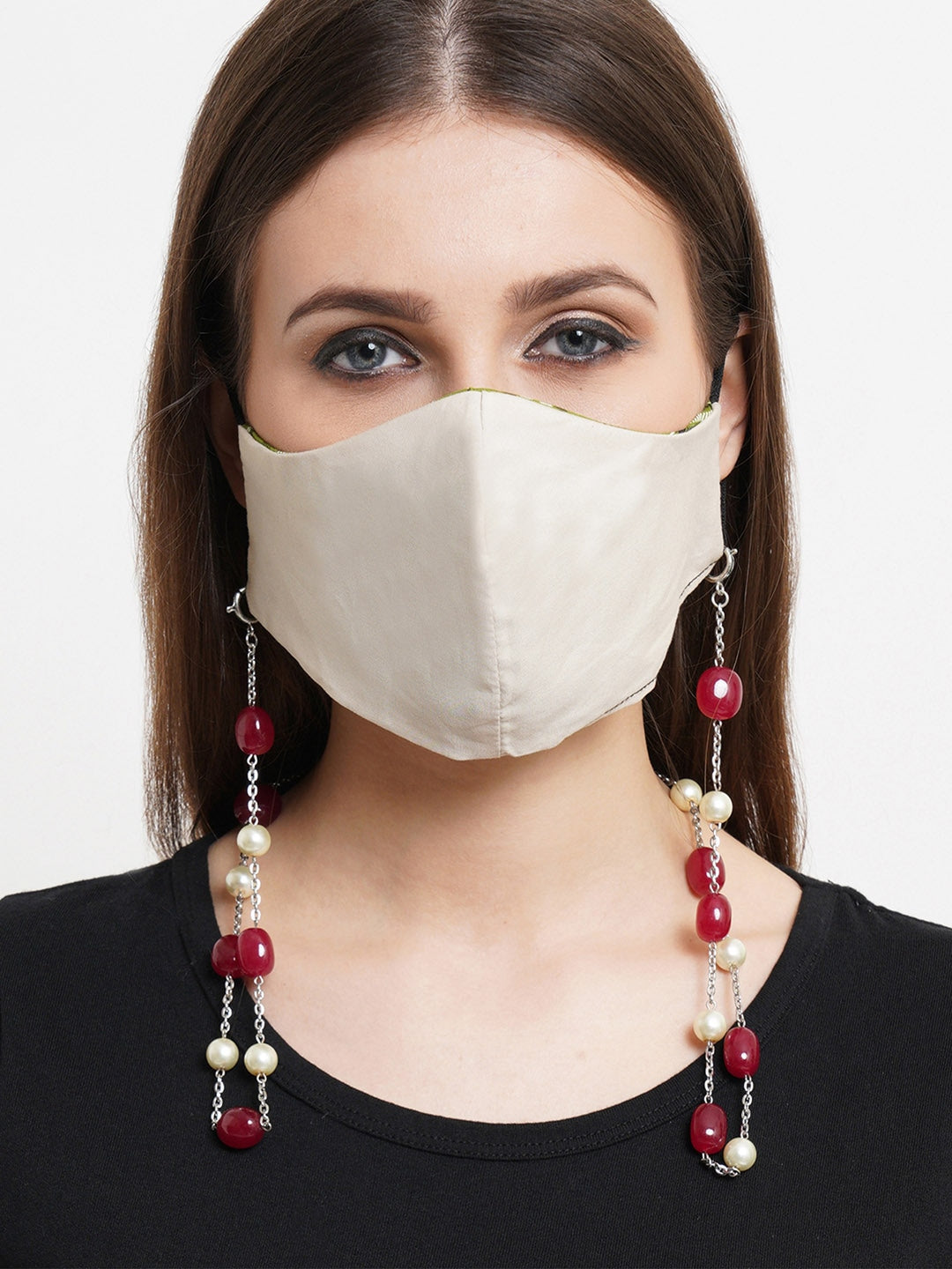 Women Red & White Tumble Stone and Pearl Studded Mask Chain