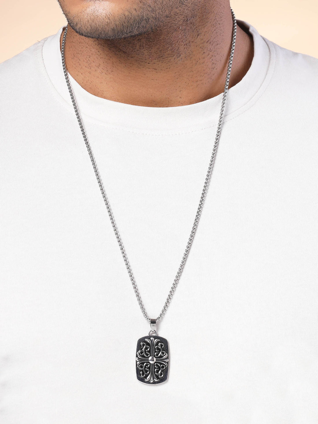 Bohey by KARATCART Silver Plated Embossed Cross Metal Chain Pendant for Men