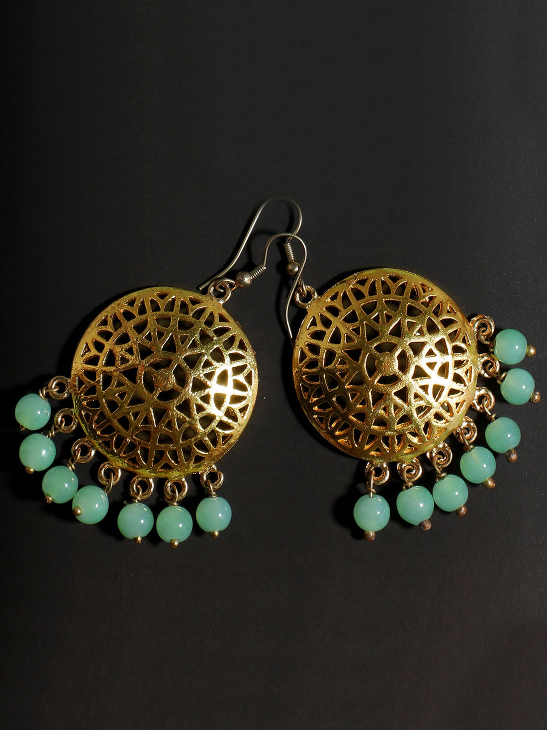 Gold Plated Mint Green Beads Kundan Dangler Earrings for Women. It's Five Layer Micro Gold...
