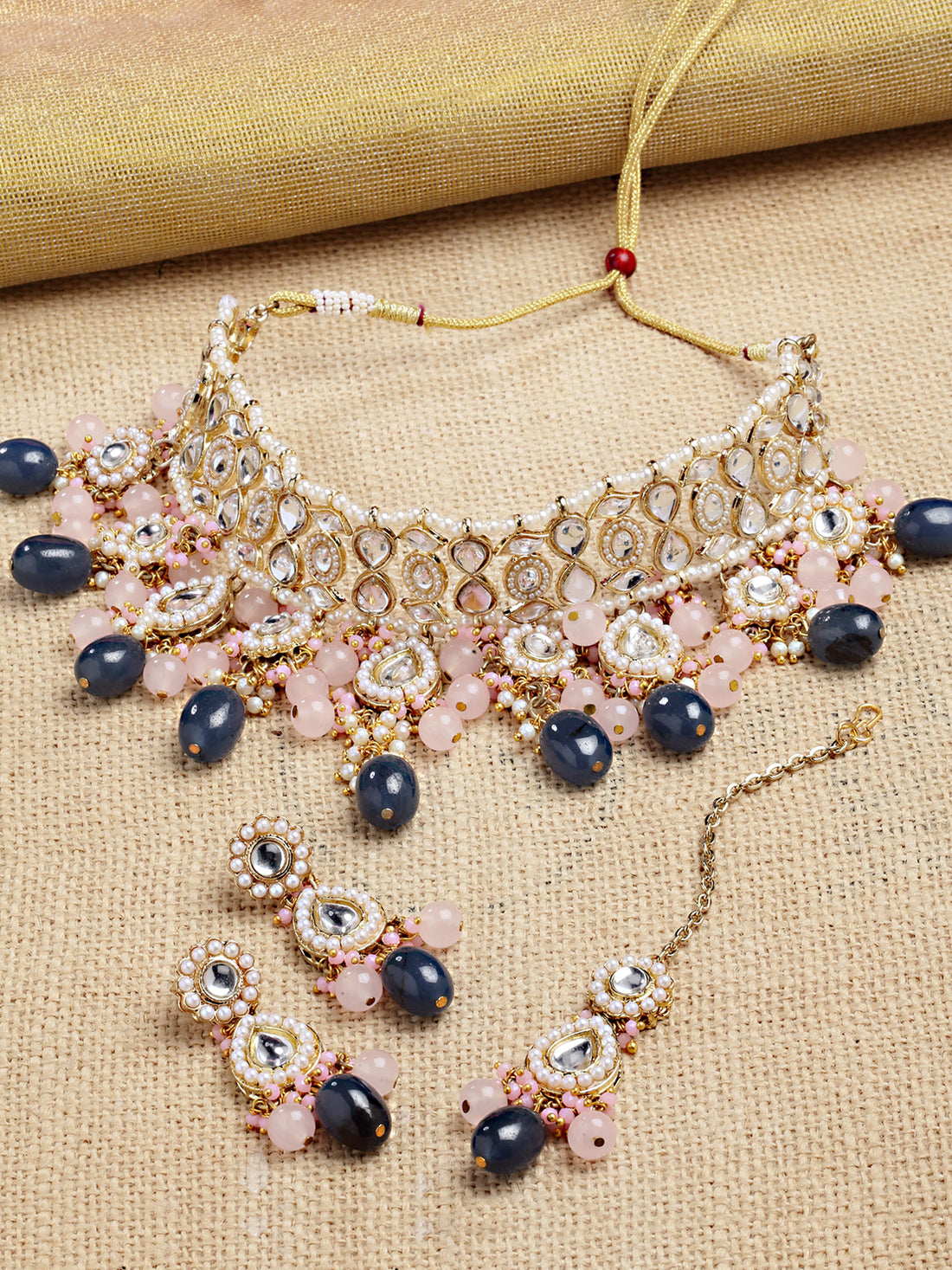 Karatcart Gold Plated Blue and Pink Kundan Choker Necklace Set for Women