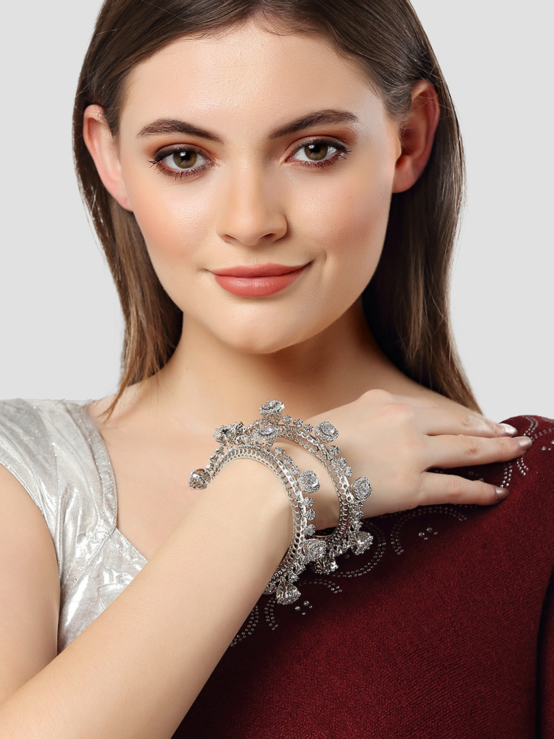 Karatcart Cubic Zirconia Studded Set of 2 Silver-Plated Bangles for Women .It's Five Layer Micro...