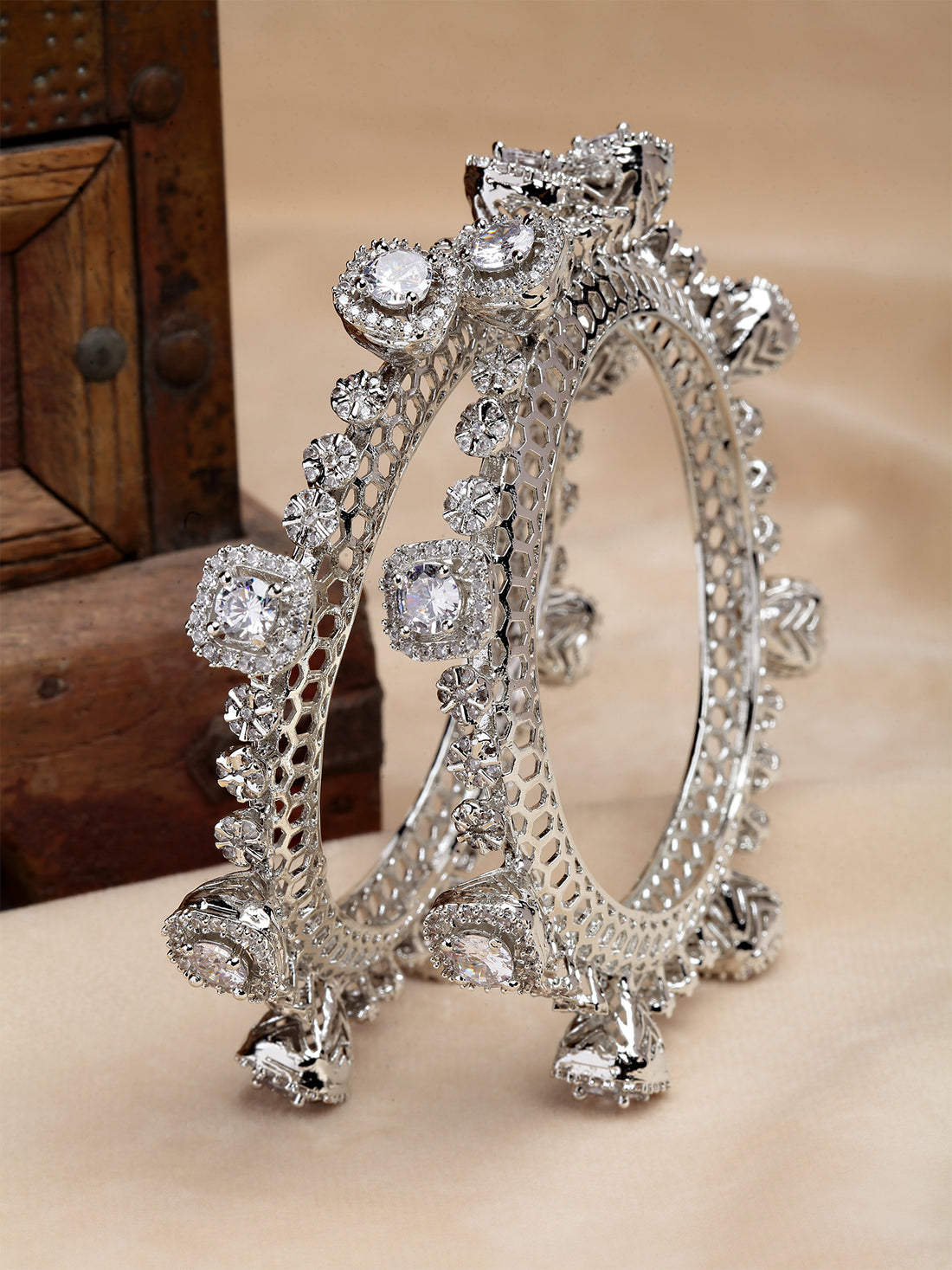 Karatcart Cubic Zirconia Studded Set of 2 Silver-Plated Bangles for Women