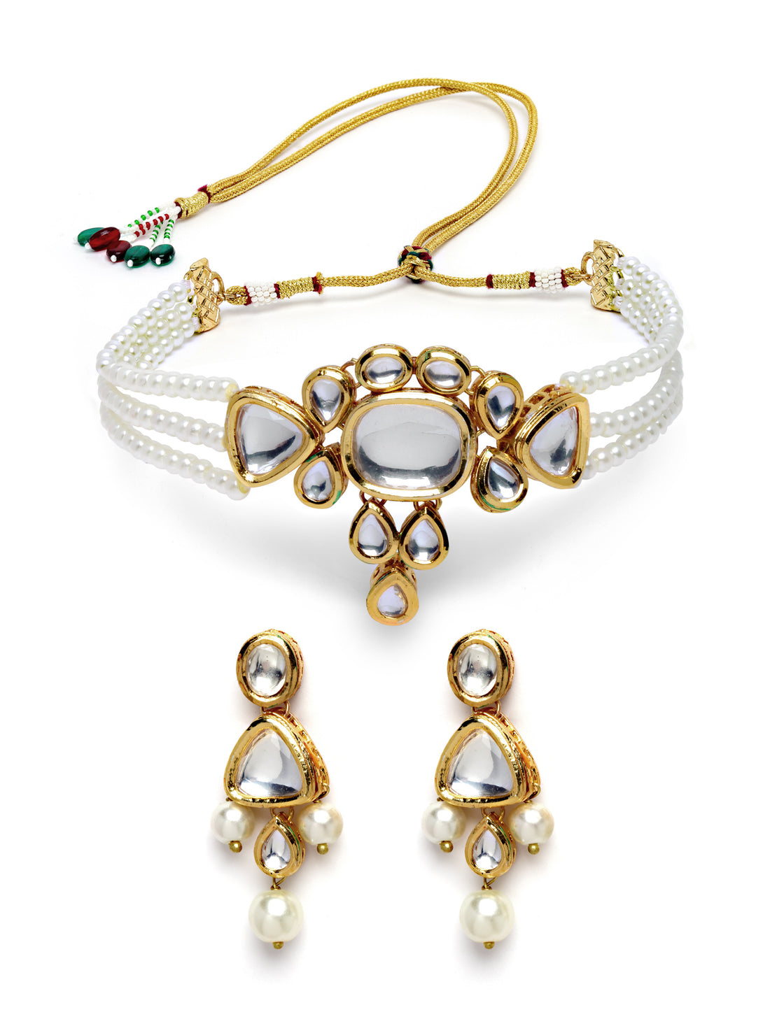 Karatcart Gold Plated Pearl Beaded Polki Choker Necklace Set. It is made with high-quality Kundan...
