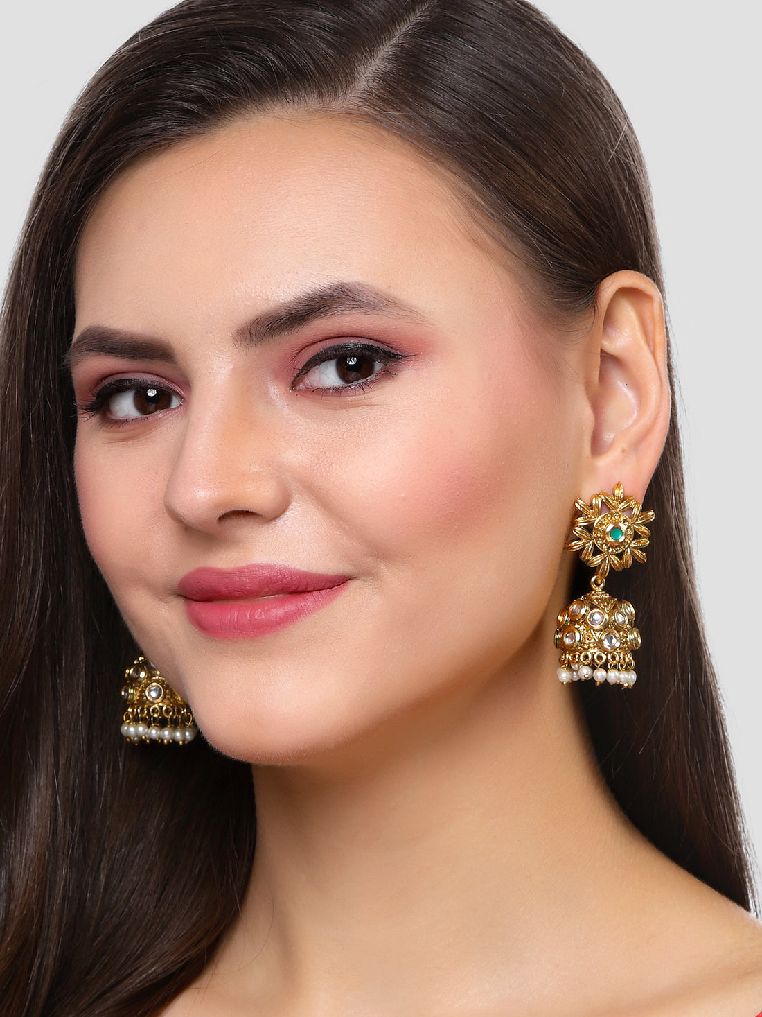 Karatcart Gold Plated Green Floral Polki Kundan Studded Jhumki Earrings for Women