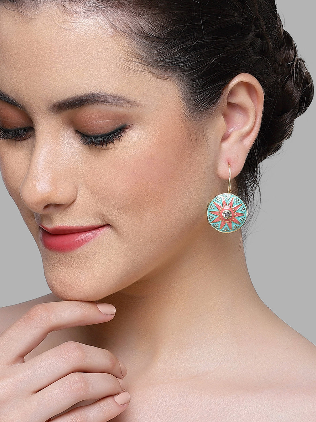 Karatcart Gold Plated Peacock Design Light Blue and Red Meena Drop Earrings for Women