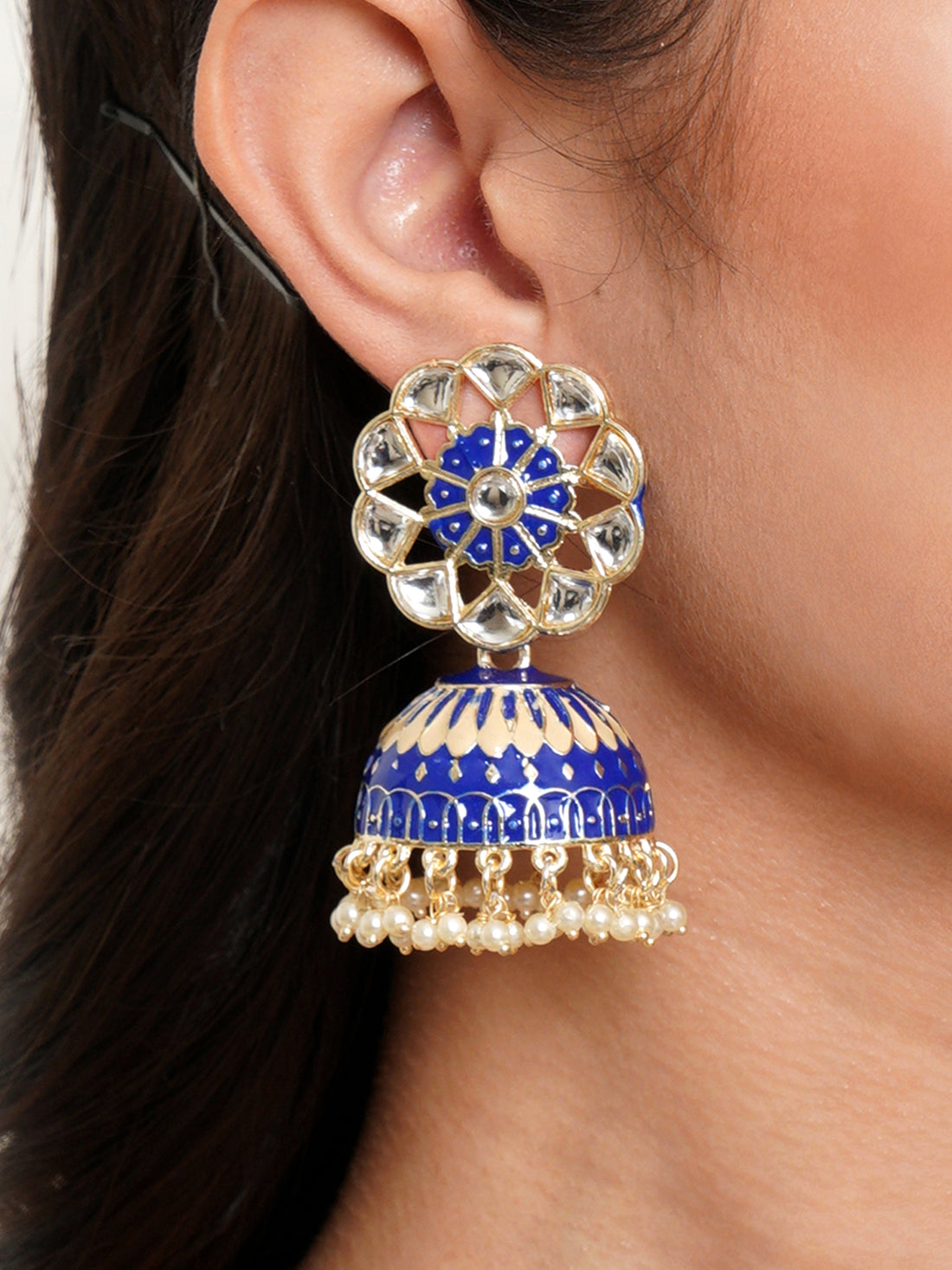 Karatcart Gold Plated Royal Blue Meena Kunda Studded Jhumki Earrings for Women