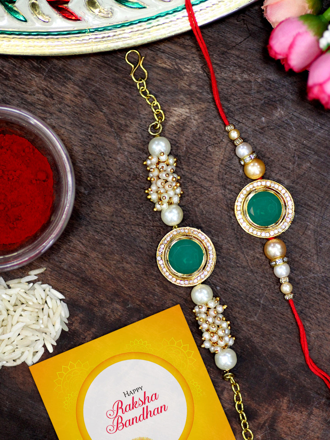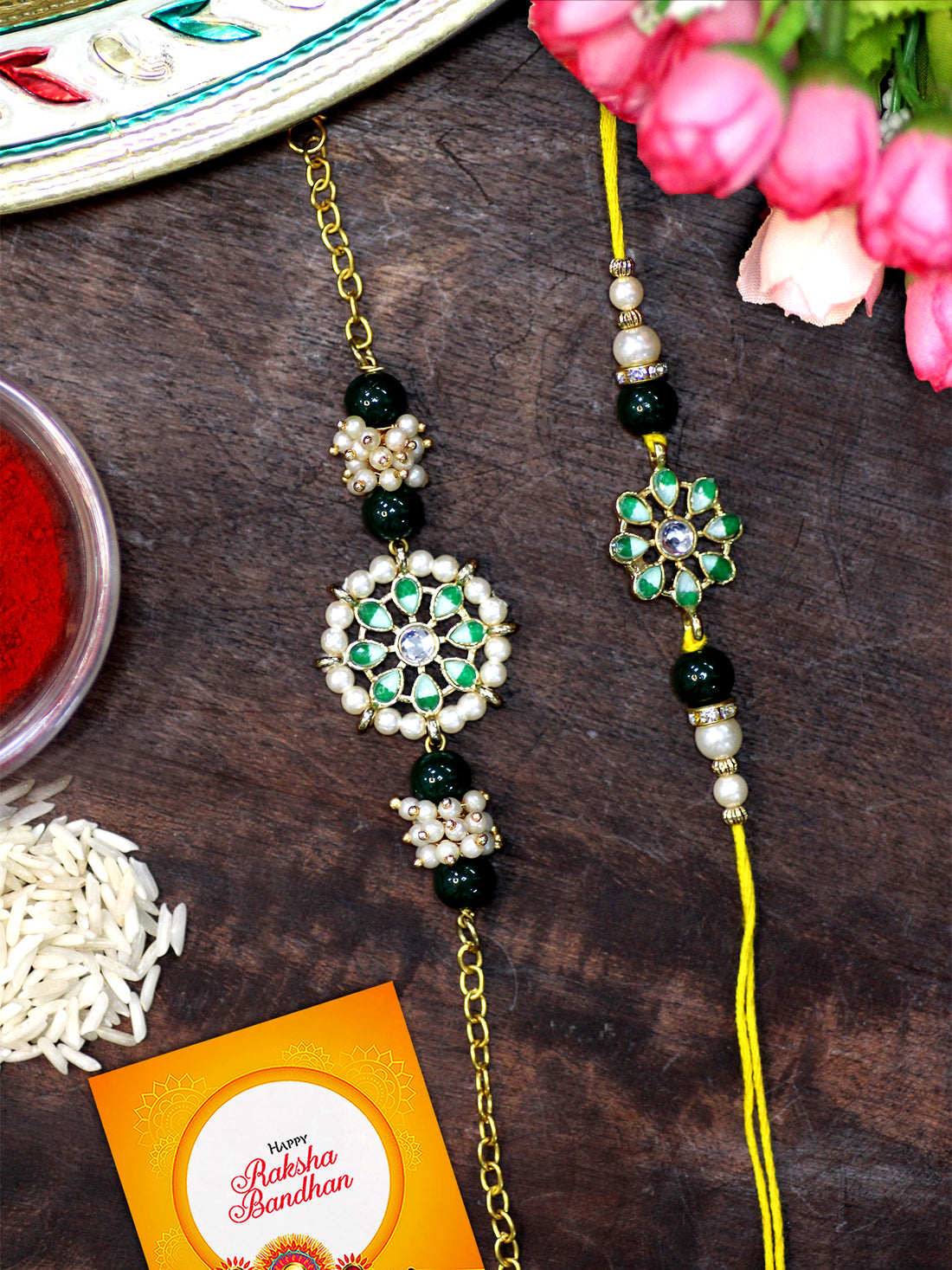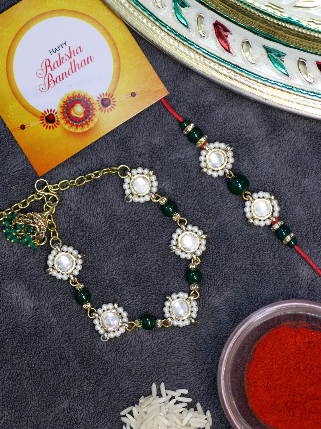 Karatcart Rakhi for Brother and Bhabhi Set of 2 Gold Plated Green Beads Handmade Kundan Bhiya Bhabhi Rakhi Combo with Roli & Chawal