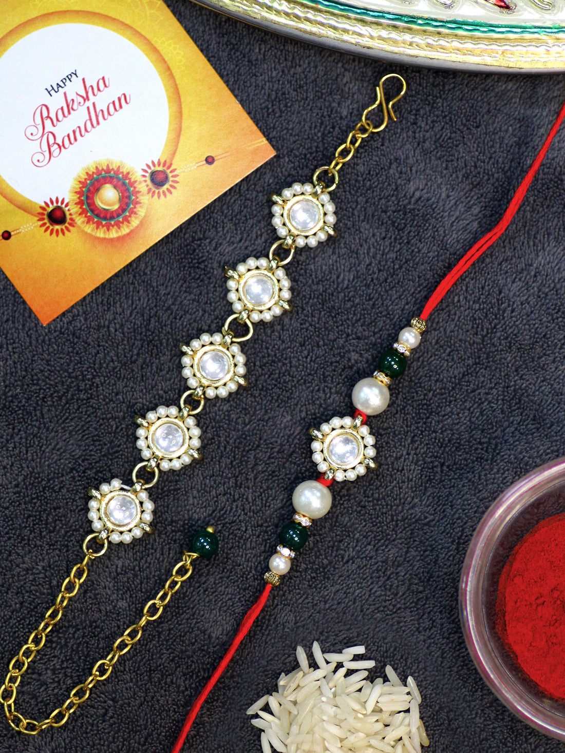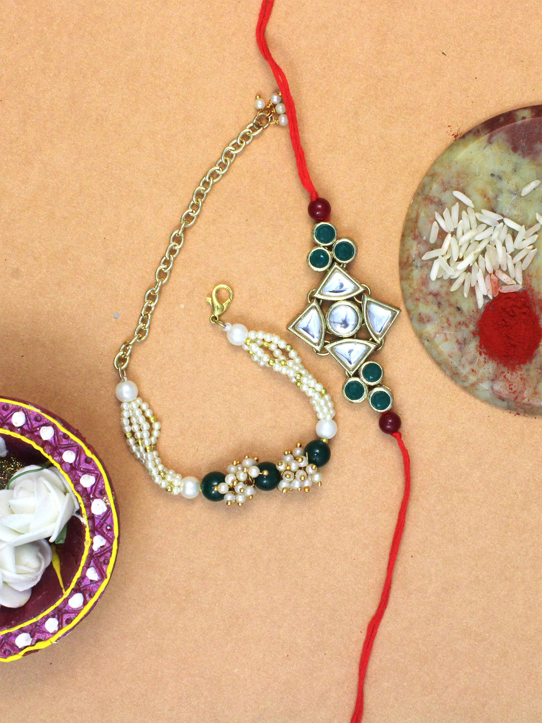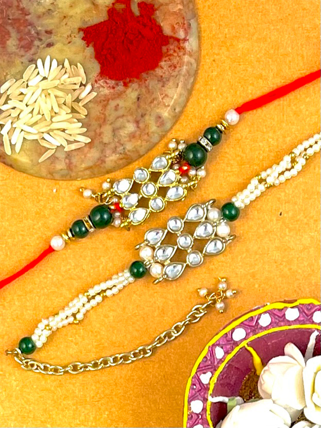 Karatcart Rakhi for Brother and Bhabhi Set of 2 Gold Plated Green Beads Handmade Kundan Bhiya Bhabhi Rakhi Combo with Roli & Chawal