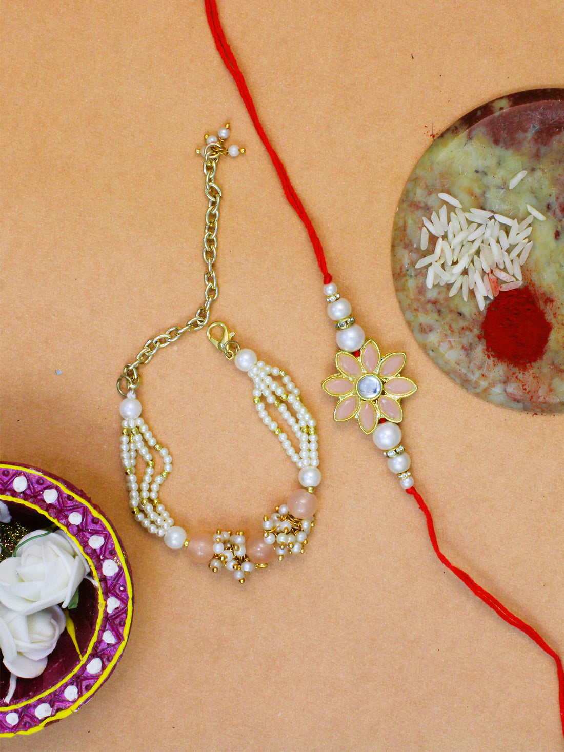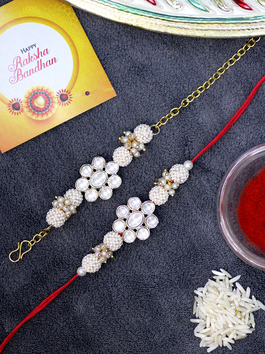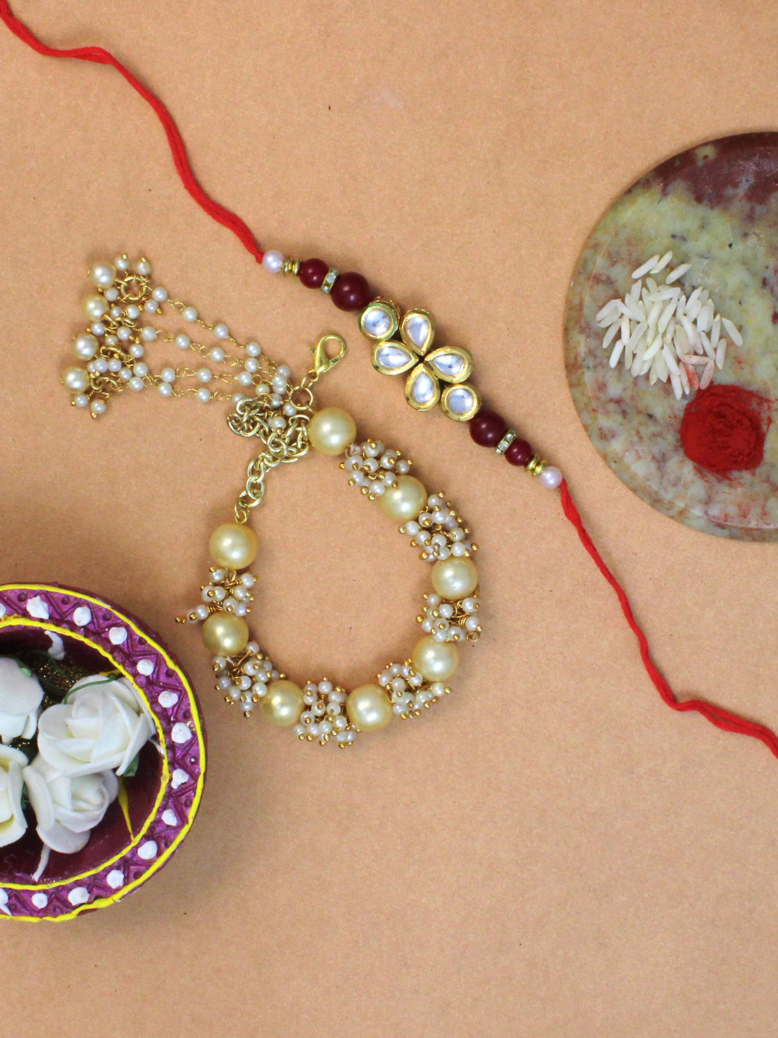 Karatcart Rakhi for Brother and Bhabhi Set of 2 Gold Plated Pearl and Flower Handmade Kundan Bhiya Bhabhi Rakhi Combo with Roli & Chawal