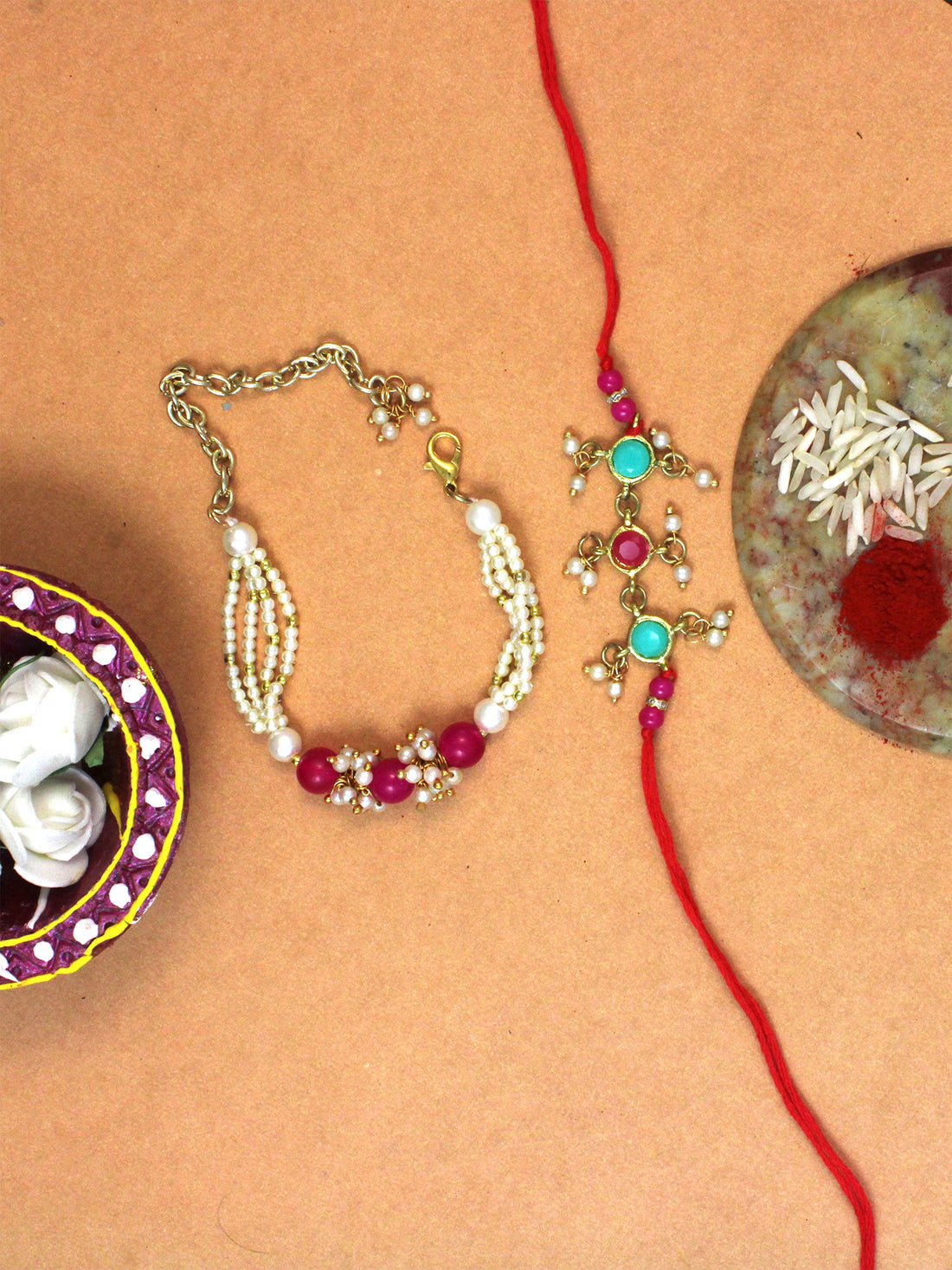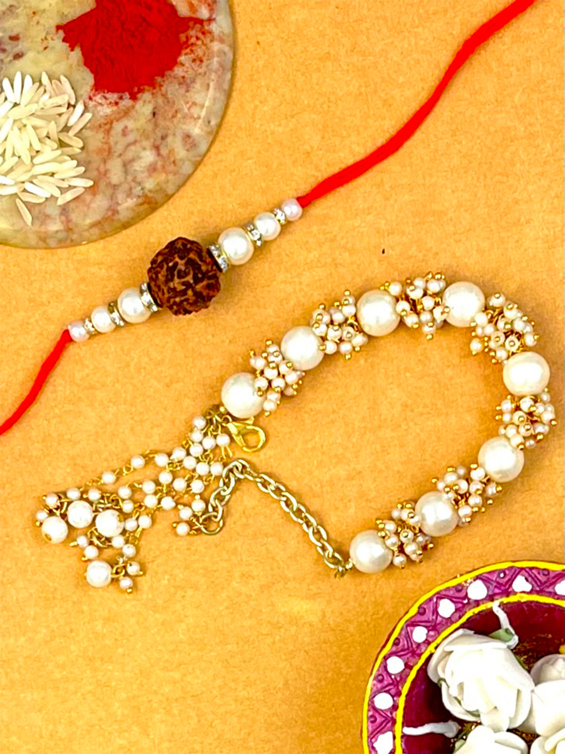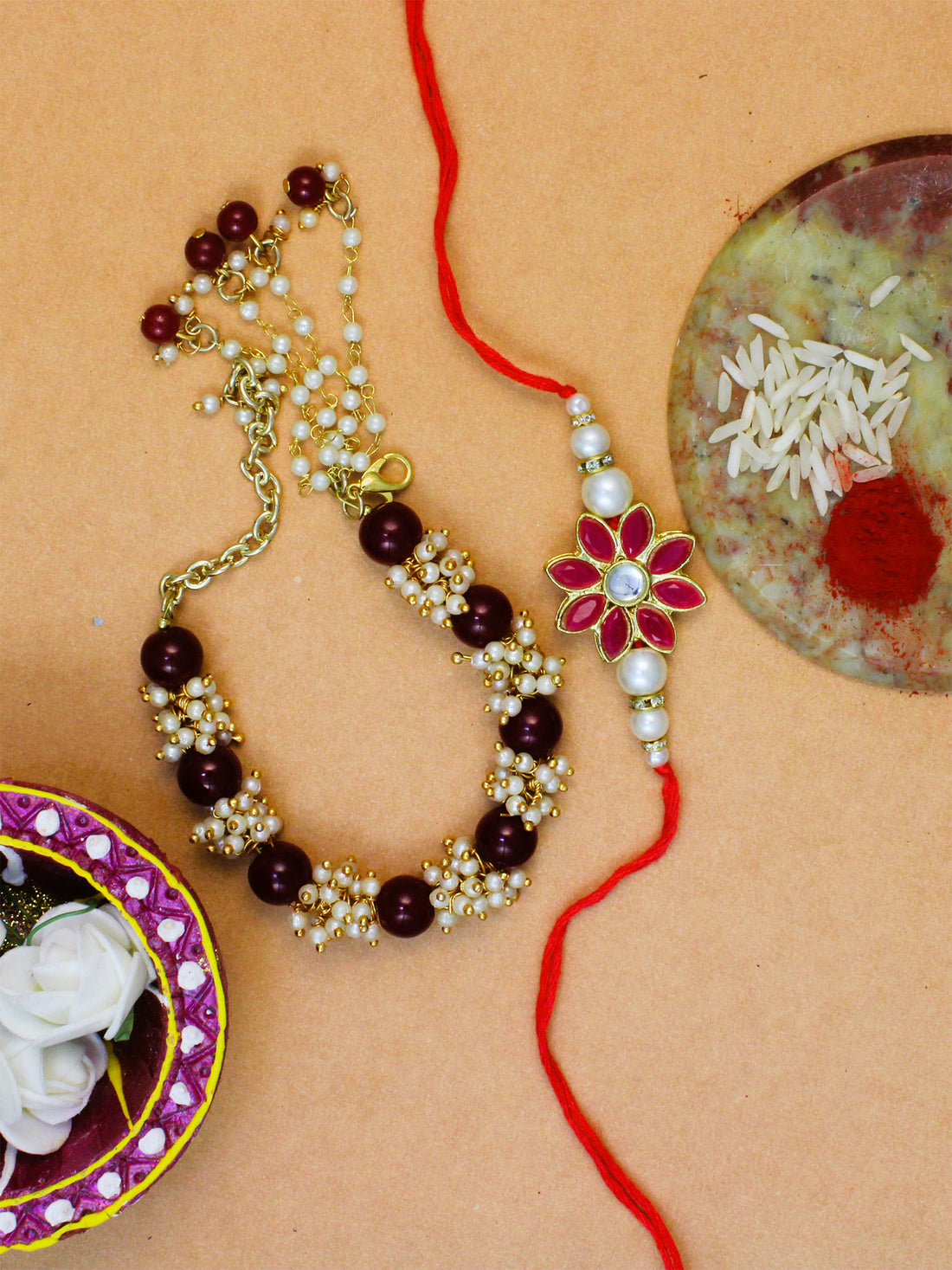 Karatcart Rakhi for Brother and Bhabhi Set of 2 Gold Plated Pearl and Flower Handmade Kundan Bhiya Bhabhi Rakhi Combo with Roli & Chawal