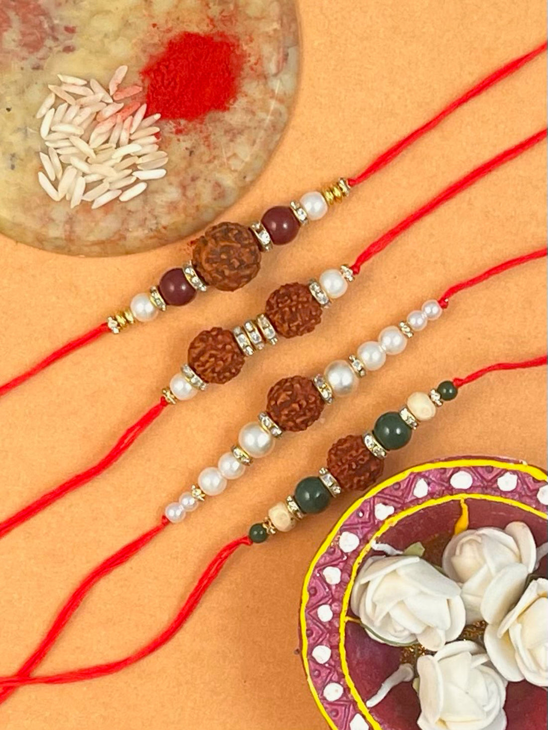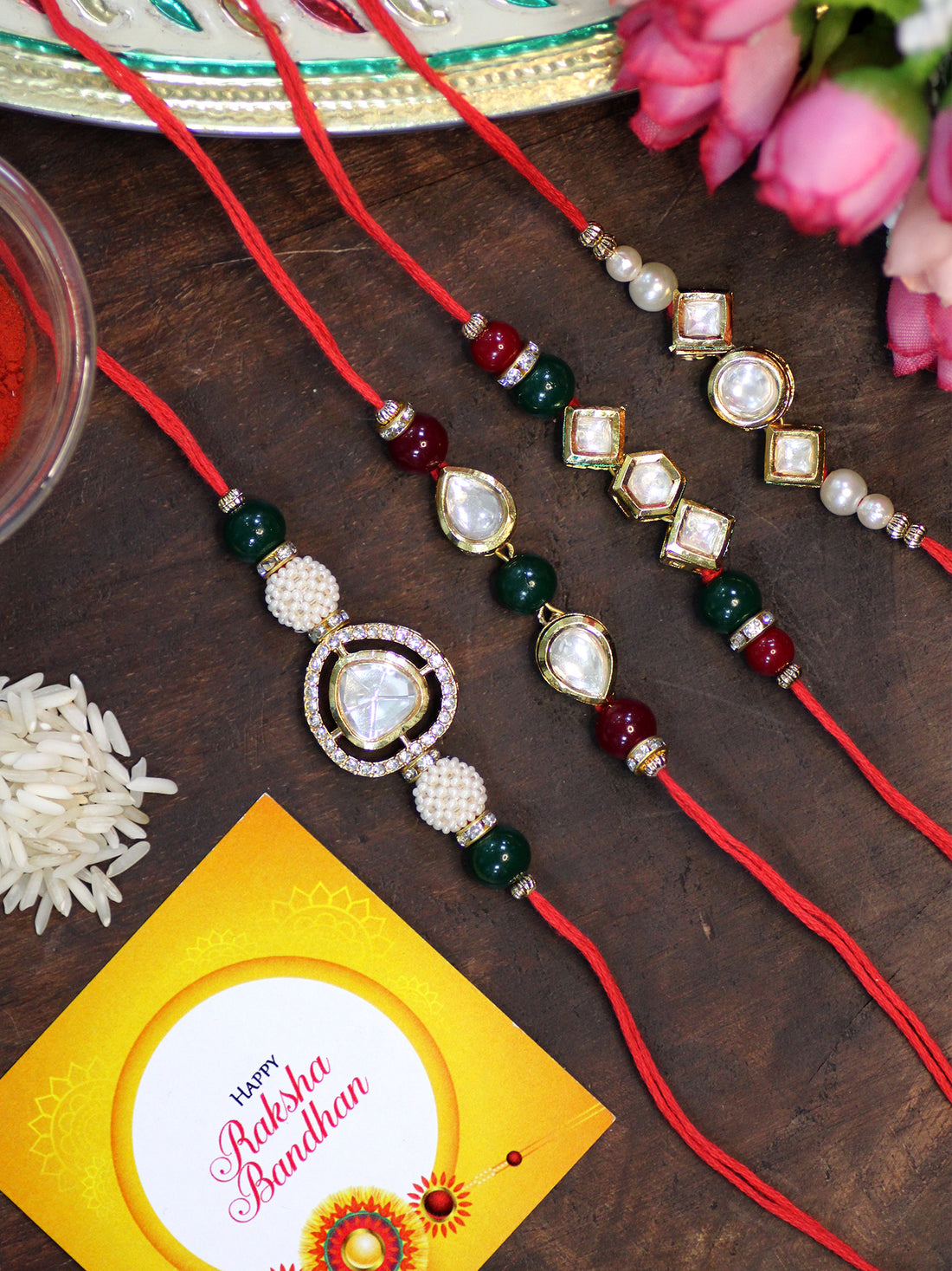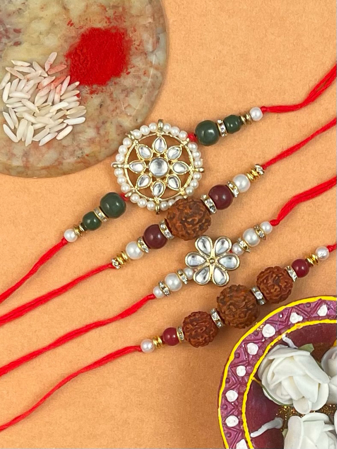 Karatcart Rakhi for Brother Set of 4 Gold Plated Handmade Polki Kundan Rakhi with Roli & Chawal