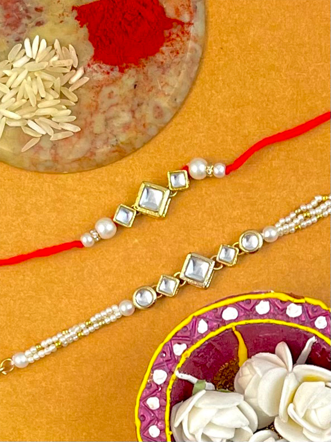 Karatcart Rakhi for Brother and Bhabhi Set of 2 Gold Plated Square Polki Kundan Bhiya Bhabhi Rakhi Combo with Roli & Chawal