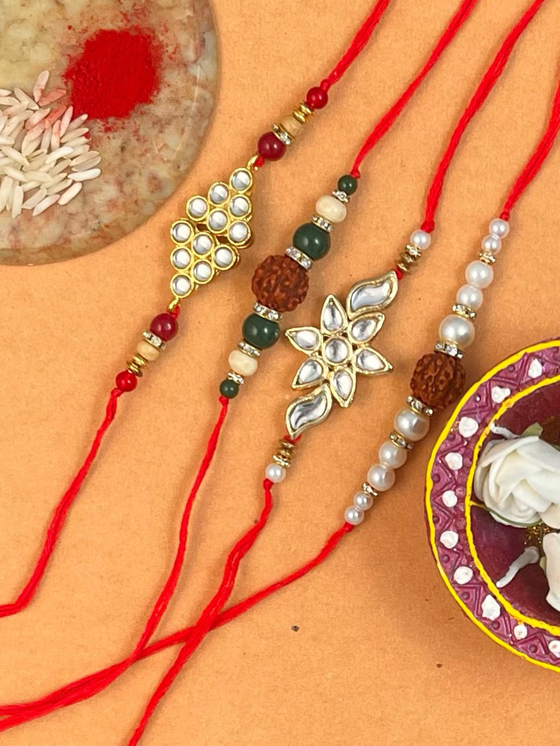 Set of 4 Gold Plated Handmade Kundan Rakhi Combo with Roli & Chawal Designer Rakhi...