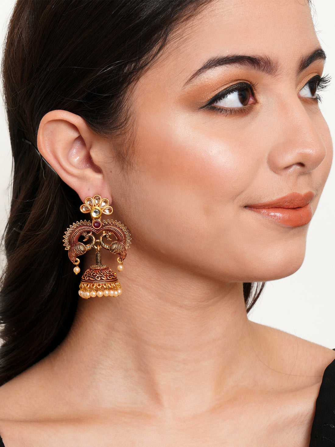 Karatcart Antique Gold Plated Maroon Designer Peacock Jhumki Earrings for Women