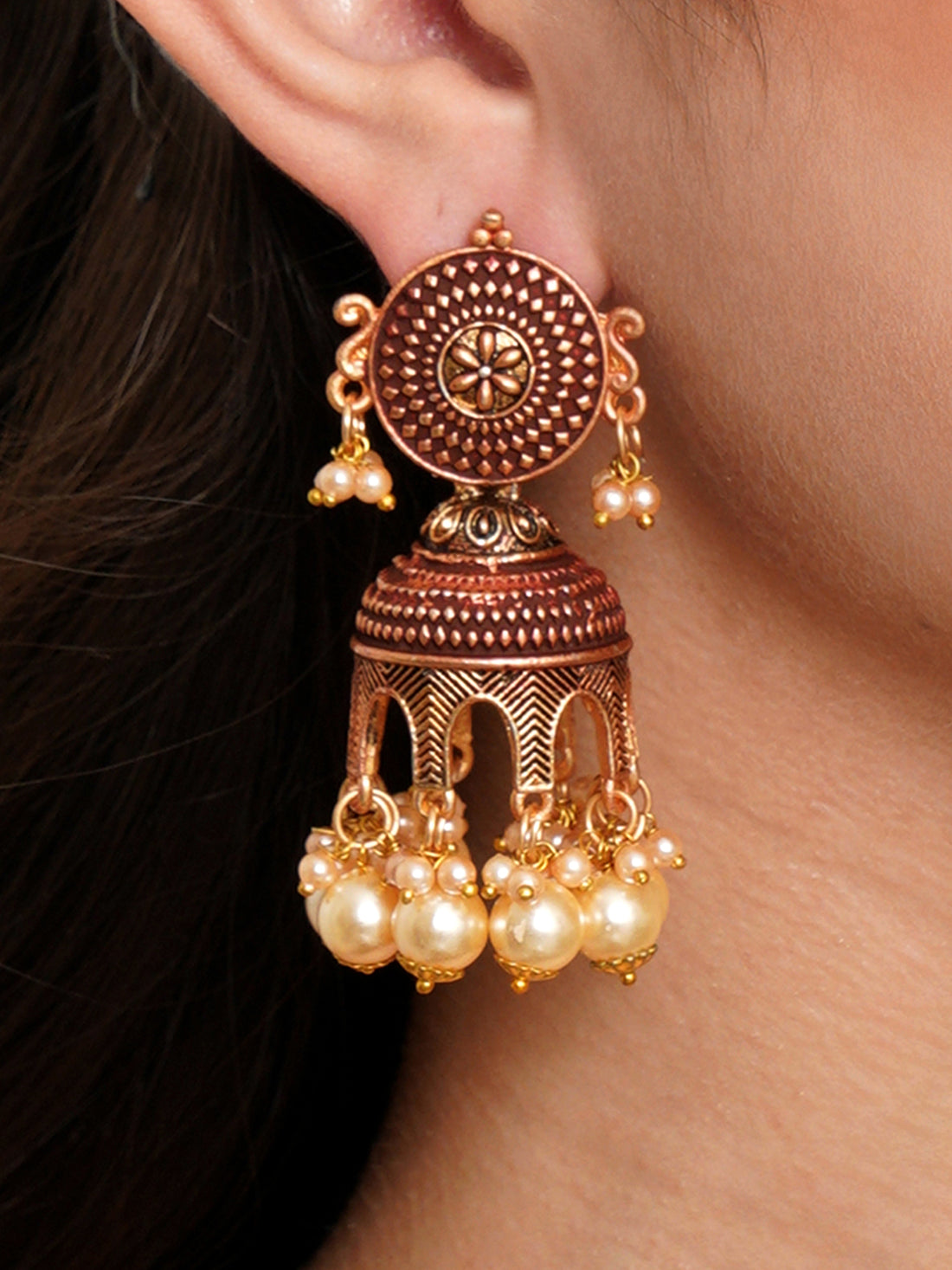 Karatcart Antique Gold Plated Maroon Tomb Style with Golden Pearl Jhumki Earrings for Women